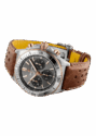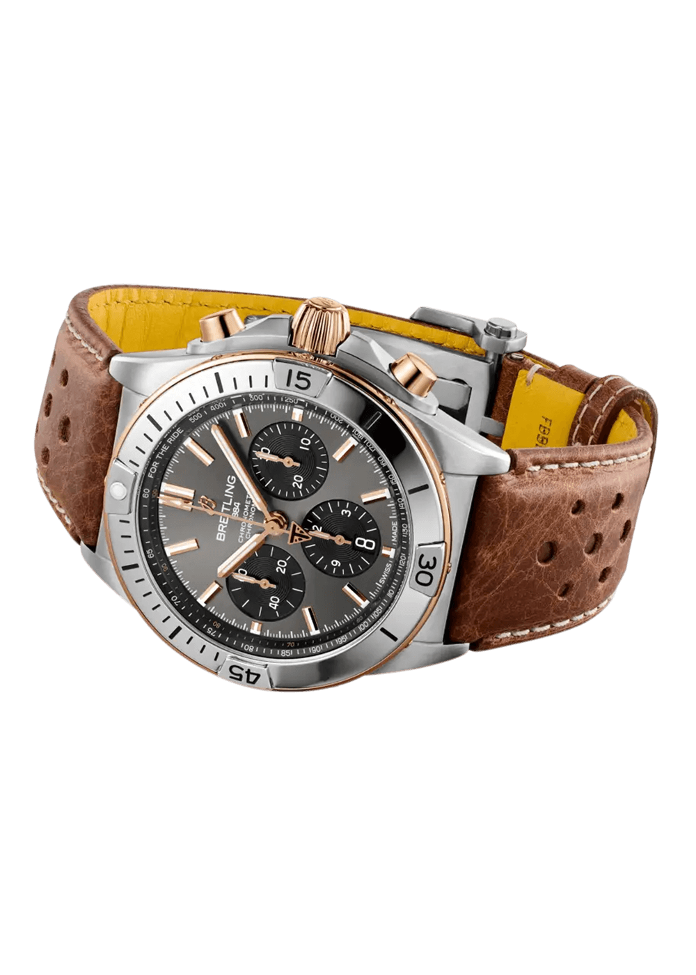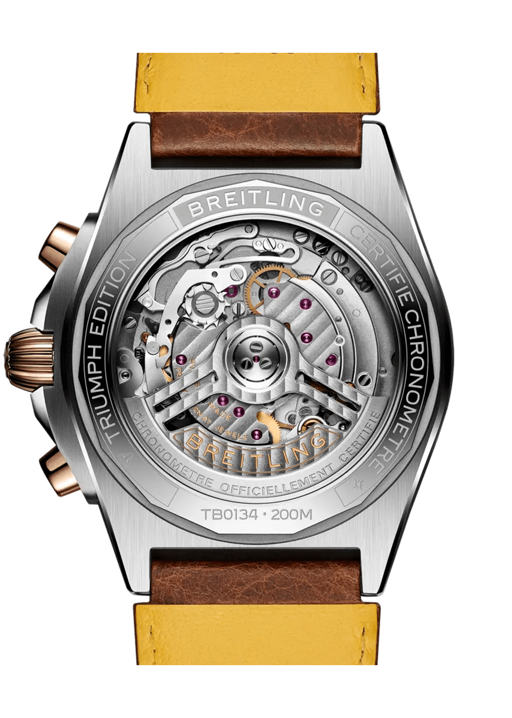 The versatile Breitling Chronomat in collaboration with the British motorbike brand Triumph. The Chronomat occupies an important place in Breitling’s history. It was launched in 1984, at a time when particularly flat quartz watches were in vogue. Breitling boldly opted for an impressively proportioned mechanical watch. The model celebrated Breitling’s centenary in style. It signalled the return of the mechanical chronograph to its rightful position of prominence within the brand, which built its worldwide reputation on these outstanding watches. The Chronomat B01 42 Triumph looks exceptionally good and is particularly comfortable to wear. It is supplied in the very highest specification in a titanium and 18-carat red gold setting.