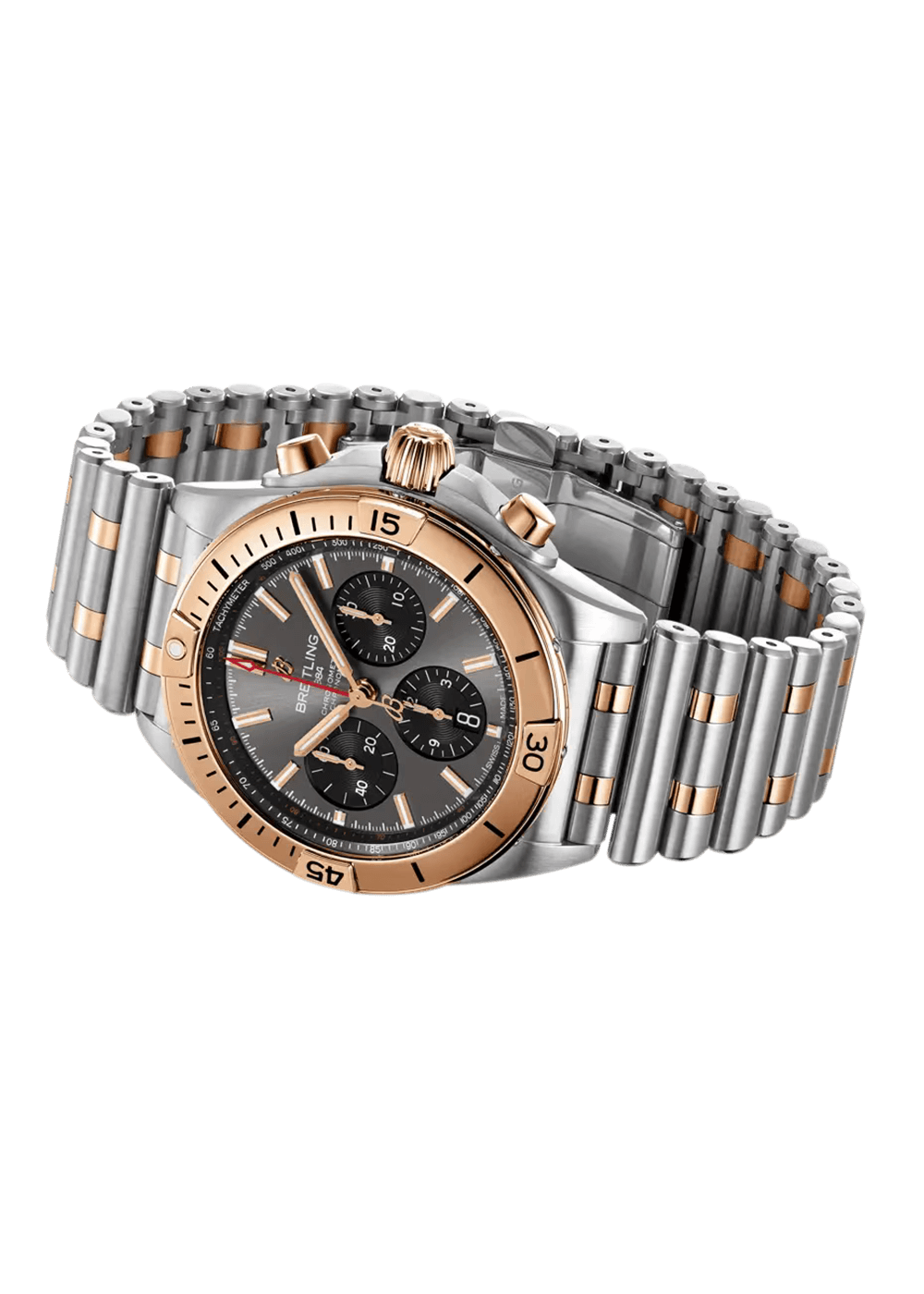 The Chronomat in this steel-gold version is available with a blue or anthracite dial and is coordinated with the characteristic Rouleaux strap.