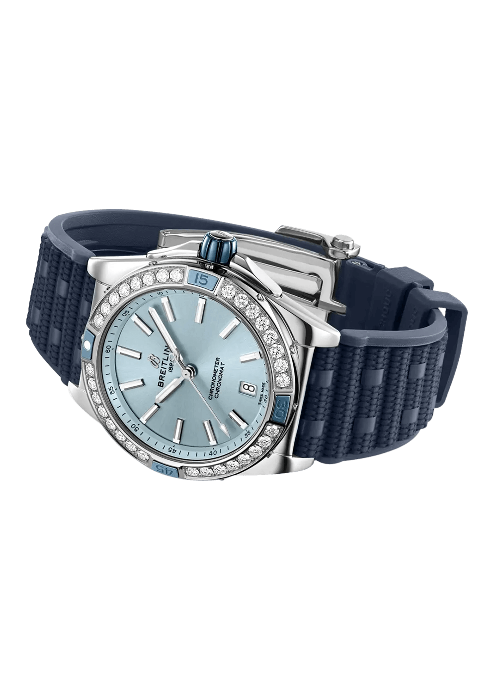 The Super Chronomat Automatic 38, the first model in the “Super” Chronomat category with a diamond bezel, wants to be an eye-catcher, whether you wear it with an elegant suit or with a T-shirt and jeans. The “Super” stands out from the rest of the Chronomat family at first glance: it has ceramic riders and a crown.