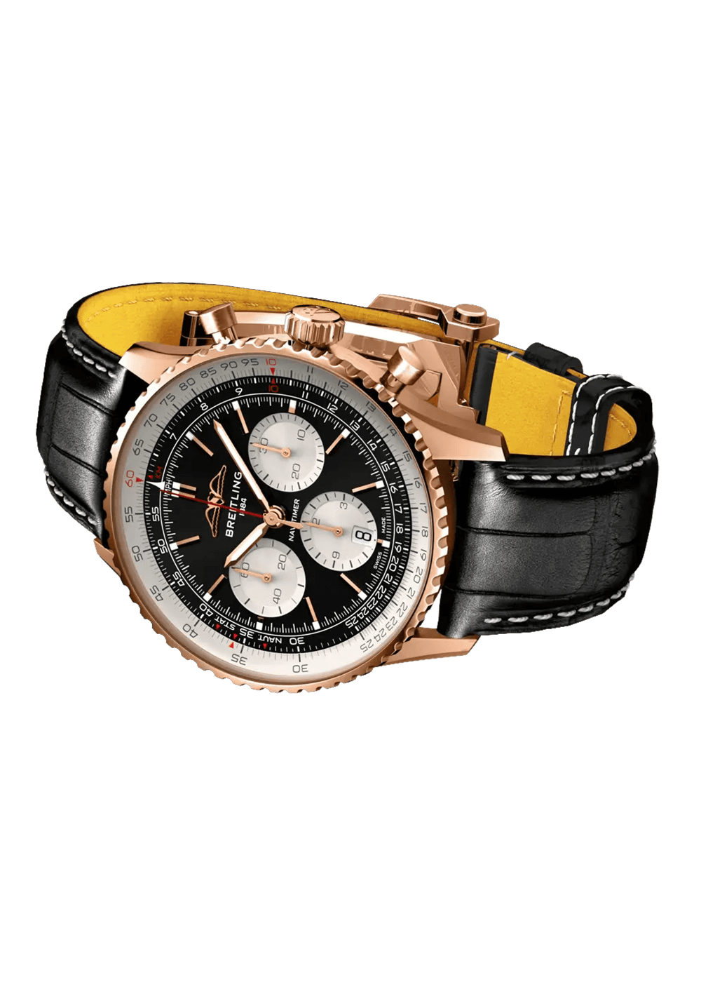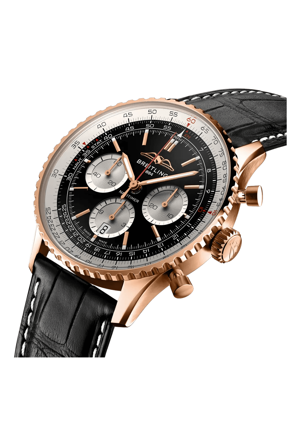 A flattened slide rule and domed glass create the impression of a more compact profile. Polished and brushed finishes give the metal elements a high-end, shiny yet understated look. Worn by astronauts in space and by the world’s biggest stars, this is Breitling’s most legendary timepiece and one of the most distinctive watches of all time.