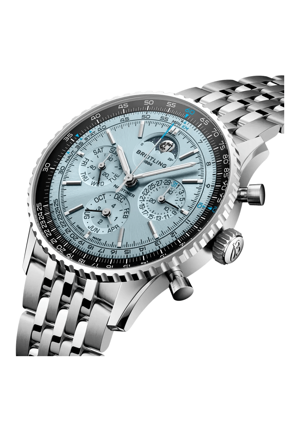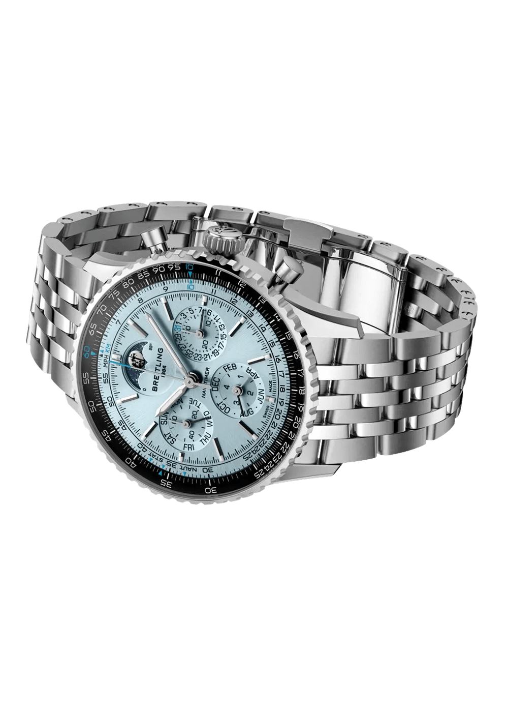 To mark our 140th anniversary, we are introducing the Caliber B19 – Breitling’s first exclusive chronograph movement with a perpetual calendar. This pioneering achievement now powers this special edition of the Navitimer, a watch with its own legendary history. The first Navitimer was developed in 1952 for the AOPA (Aircraft Owners and Pilots Association) and combined a chronograph with Breitling’s patented circular slide rule for precise flight calculations in the cockpit.
