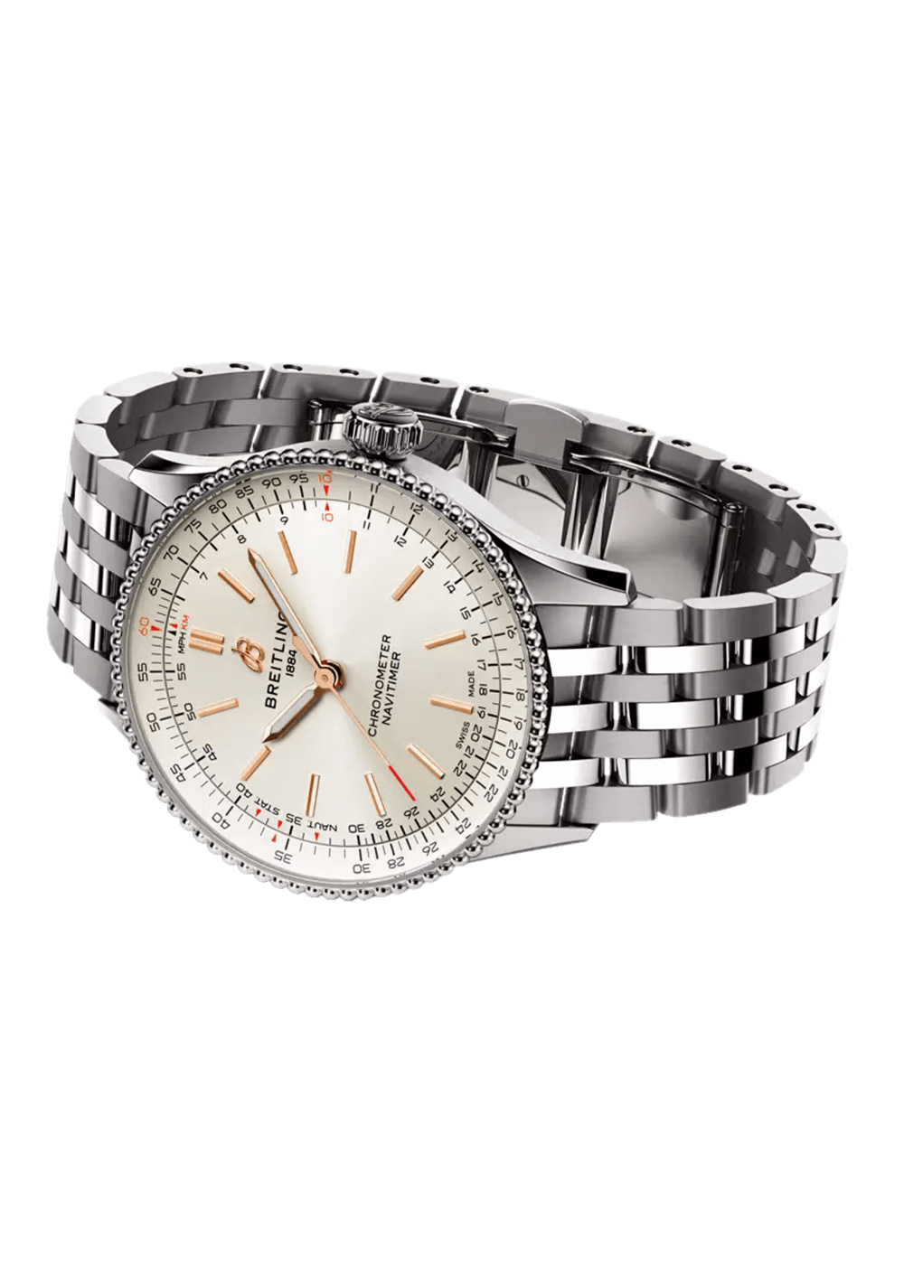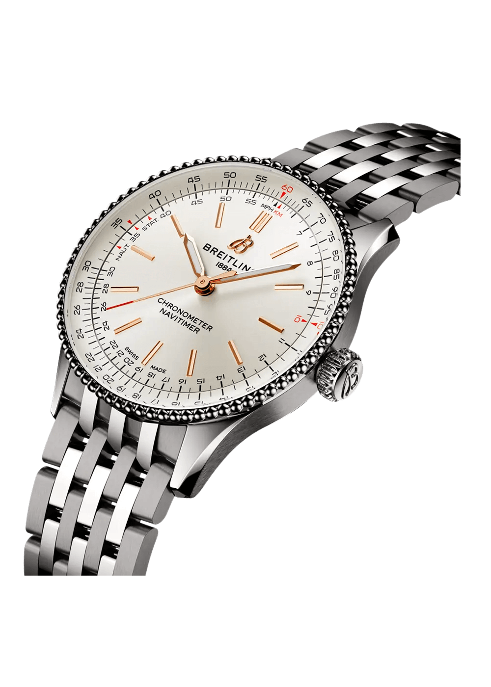 The icon now comes in 36 and 32 mm sizes for women and men who love the look and feel of a watch with a smaller diameter. While the 36mm Navitimer features the beaded bezel and iconic circular slide rule that give the Navitimer its distinctive look, the impressive 32mm variant forgoes the slide rule in favor of a simpler dial design tailored to the slim diameter.