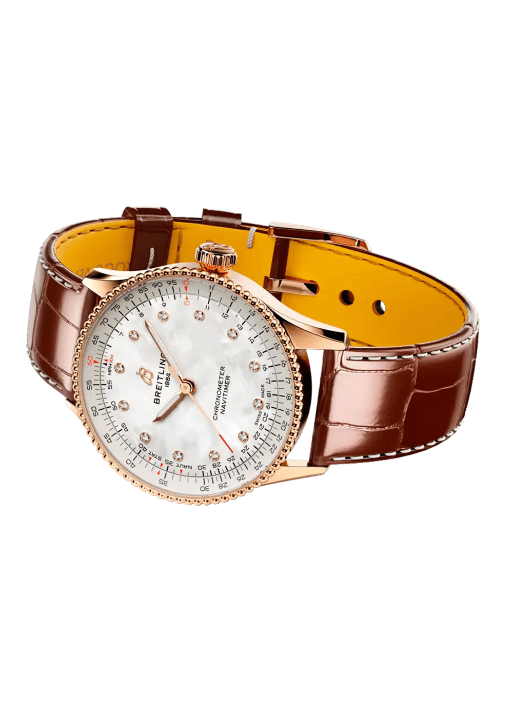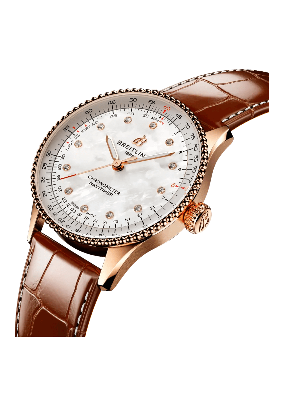 The icon now comes in 36 and 32 mm sizes for women and men who love the look and feel of a watch with a smaller diameter. While the 36mm Navitimer features the beaded bezel and iconic circular slide rule that give the Navitimer its distinctive look, the impressive 32mm variant forgoes the slide rule in favor of a simpler dial design tailored to the slim diameter.