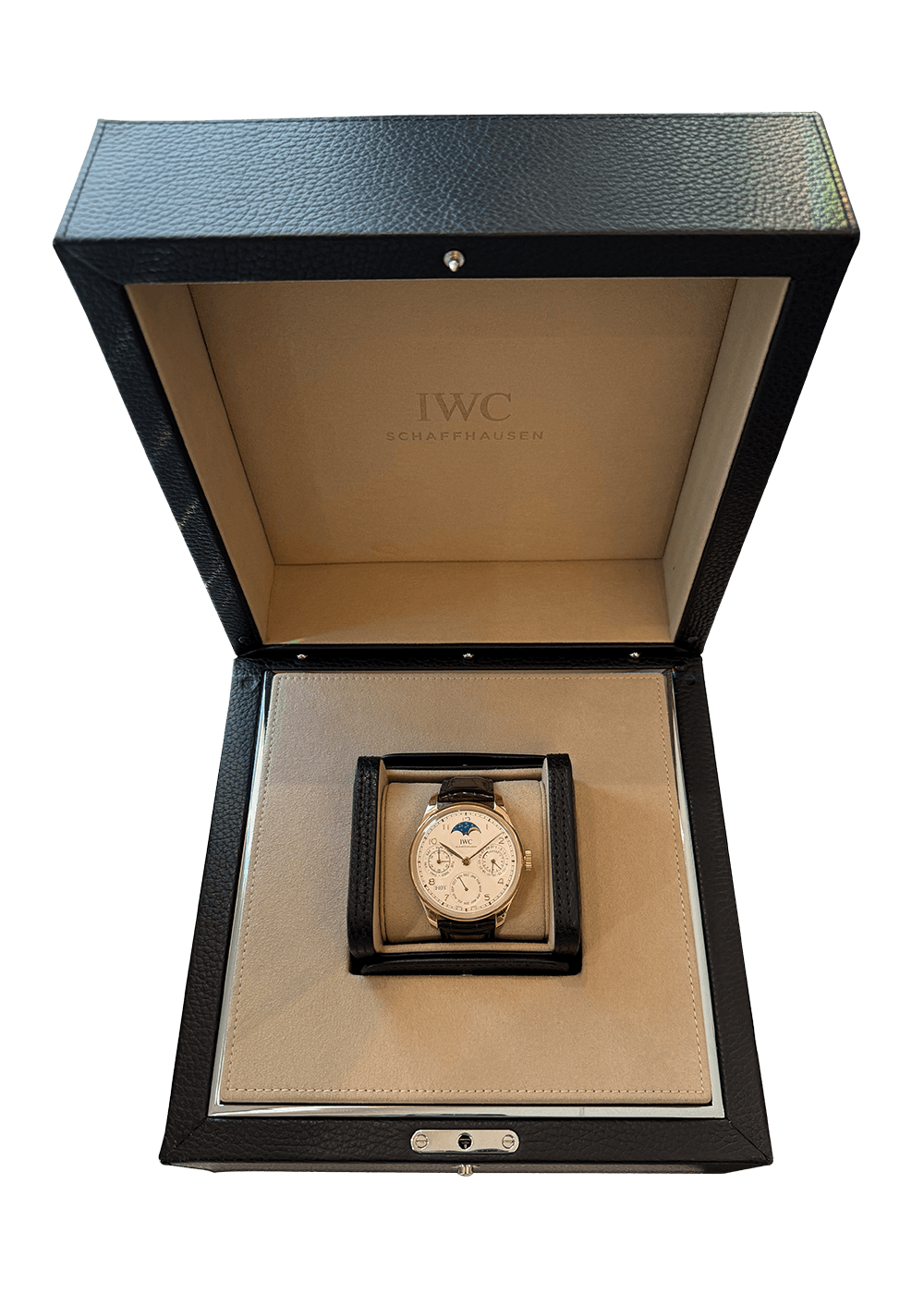 The Portugieser Perpetual Calendar is renowned for its exceptional perpetual calendar, which automatically takes into account all month lengths and even leap years until 2499. What makes it so special is that the calendar can be set completely and harmoniously using a single crown. Once correctly set, no manual correction is necessary for centuries, making this mechanism a highlight of watchmaking engineering. Added to this are a seven-day power reserve and the efficient Pellaton winding system.