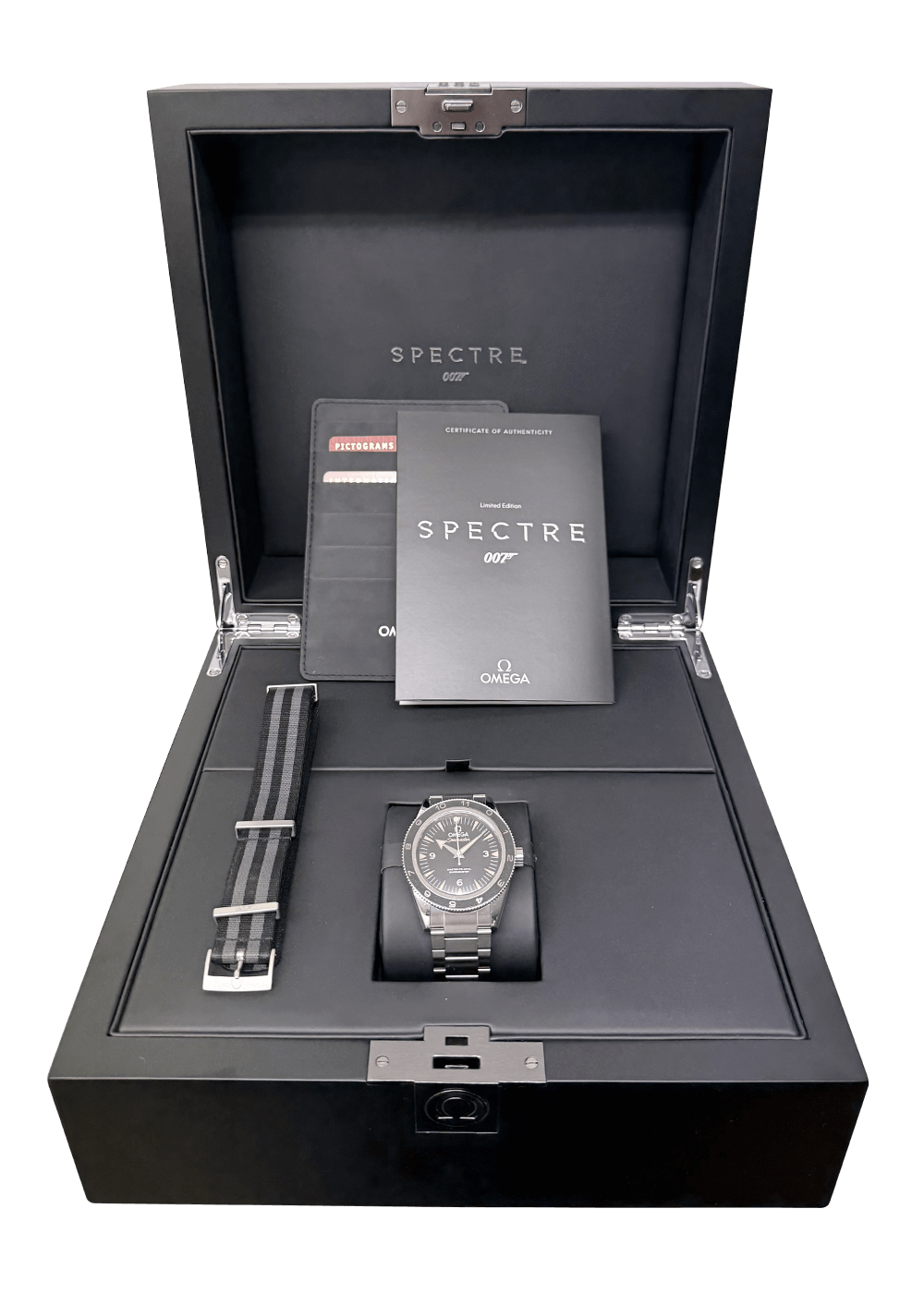 The Omega Seamaster 300 Master Co-Axial Chronometer pays homage to the iconic diving watch from 1957, but combines the best of modern watchmaking. The model is equipped with the highly accurate, anti-magnetic Master Co-Axial calibre, which delivers chronometer-certified performance. The special “SPECTRE” Limited Edition is distinguished by its unique bidirectional rotating 12-hour bezel and “lollipop” seconds hand.