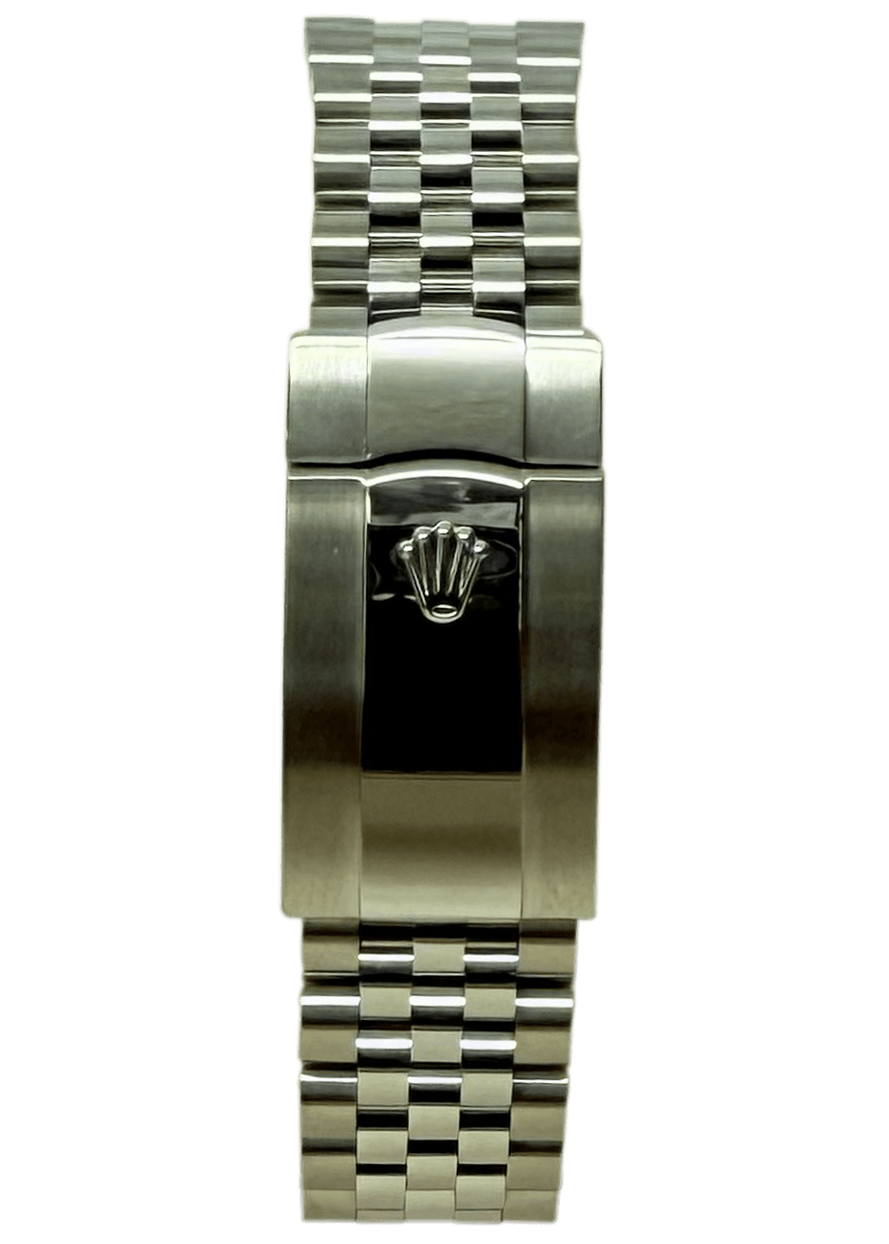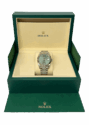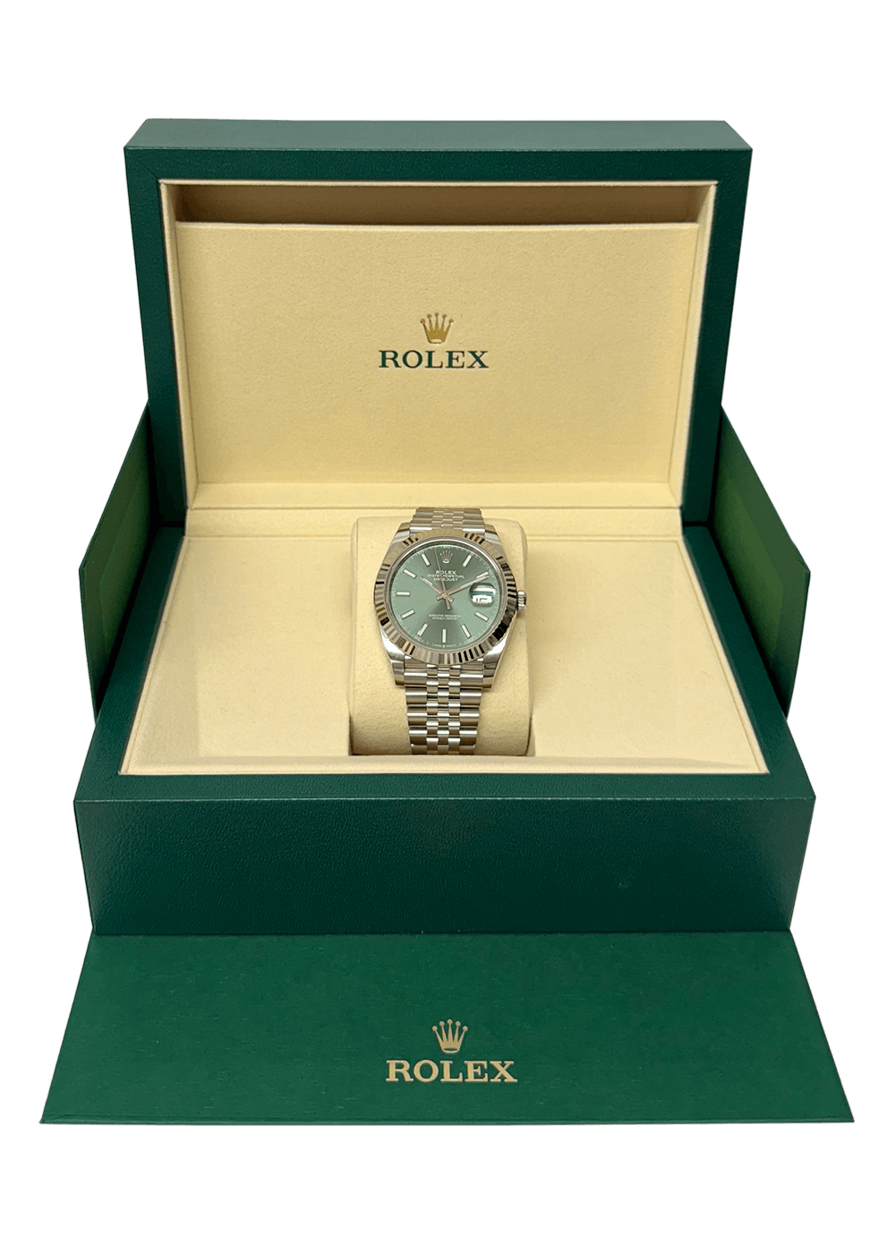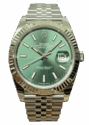 This Oyster Perpetual Datejust 41, crafted from Oystersteel and white gold, features a bright green dial and a Jubilee bracelet.
