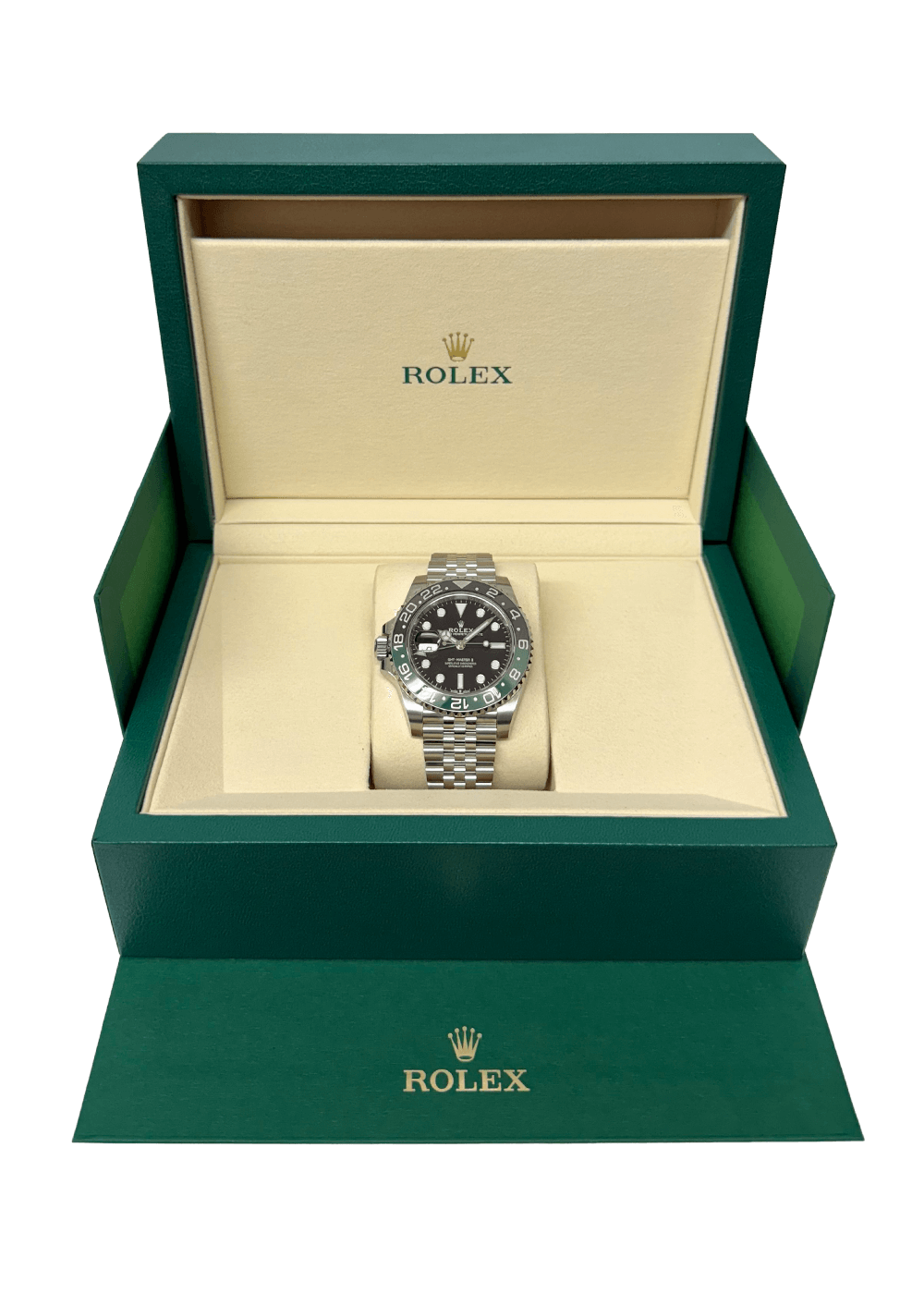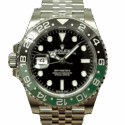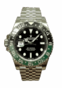 The Rolex GMT-Master II “Sprite” is a sporty and elegant GMT watch with a striking green and black Cerachrom bezel, a black dial, and the high-precision Rolex caliber 3285. Its left crown is particularly eye-catching, making it one of the most unusual and sought-after modern GMT-Master II variants.