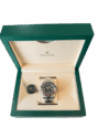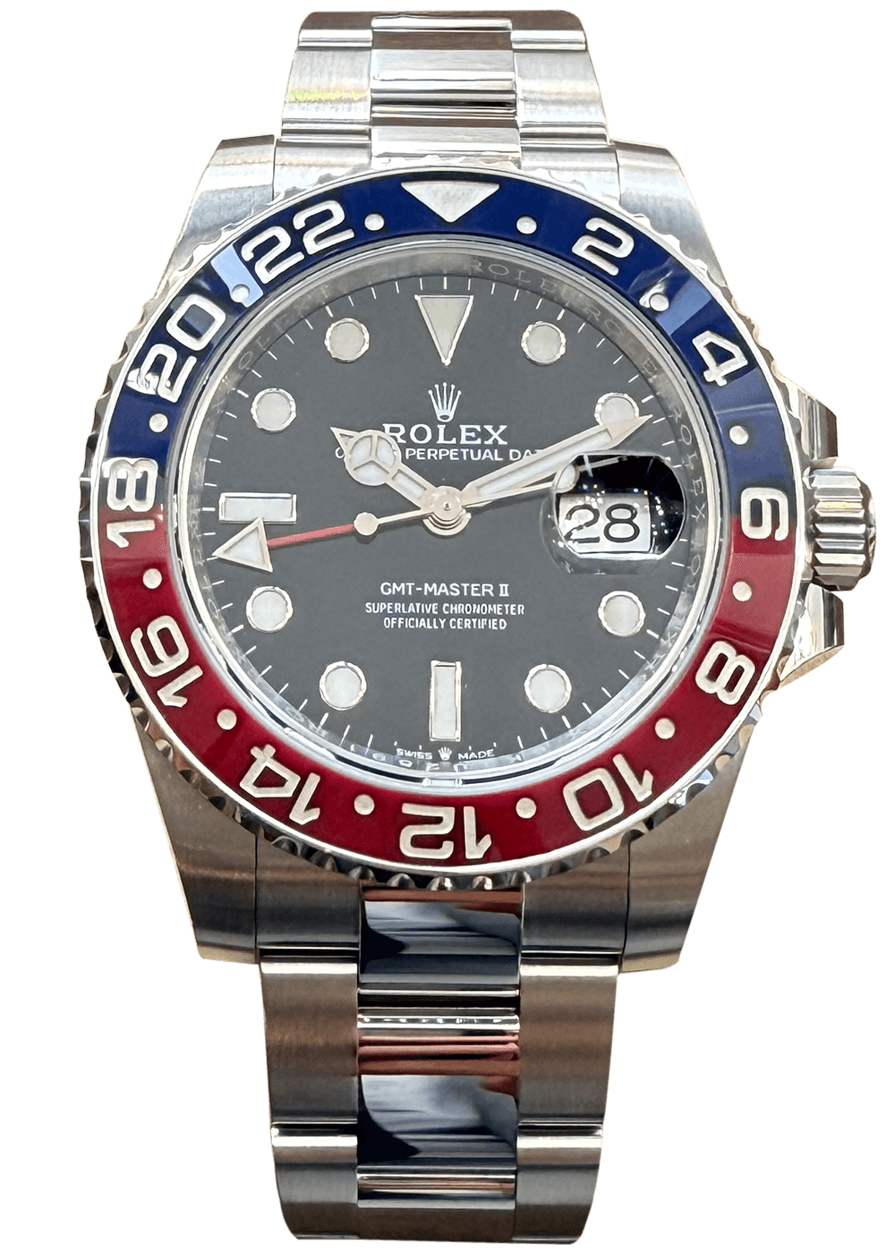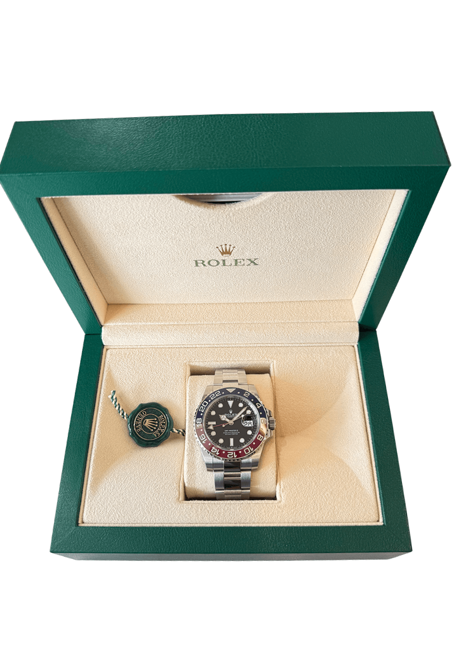 This model has a black dial and a two-colour Cerachrom dial made of red and blue ceramic. In addition to the traditional hour, minute and second hands, the GMT-Master II has an additional hand with an arrow-shaped tip that rotates around the dial once every 24 hours, as well as a bidirectional rotating bezel with 24-hour graduations.