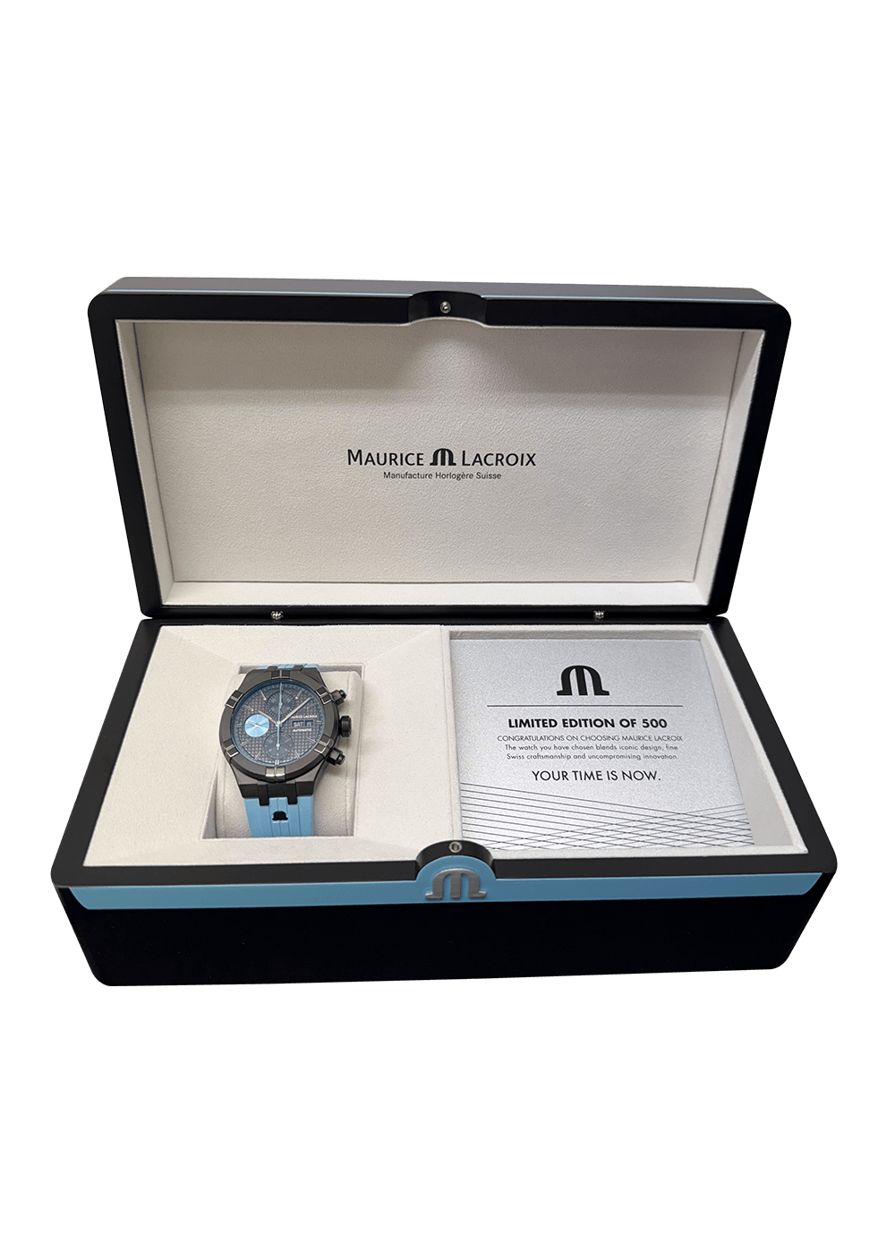 This Maurice Lacroix Limited Edition combines urban style with precise mechanical performance. The black dial with totalisers for the chronograph function ensures a sporty aesthetic and maximum readability. In addition to reliable timekeeping, this model offers a stopwatch function, weekday and date display, powered by a mechanical heart designed for modern city life.
