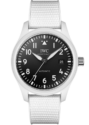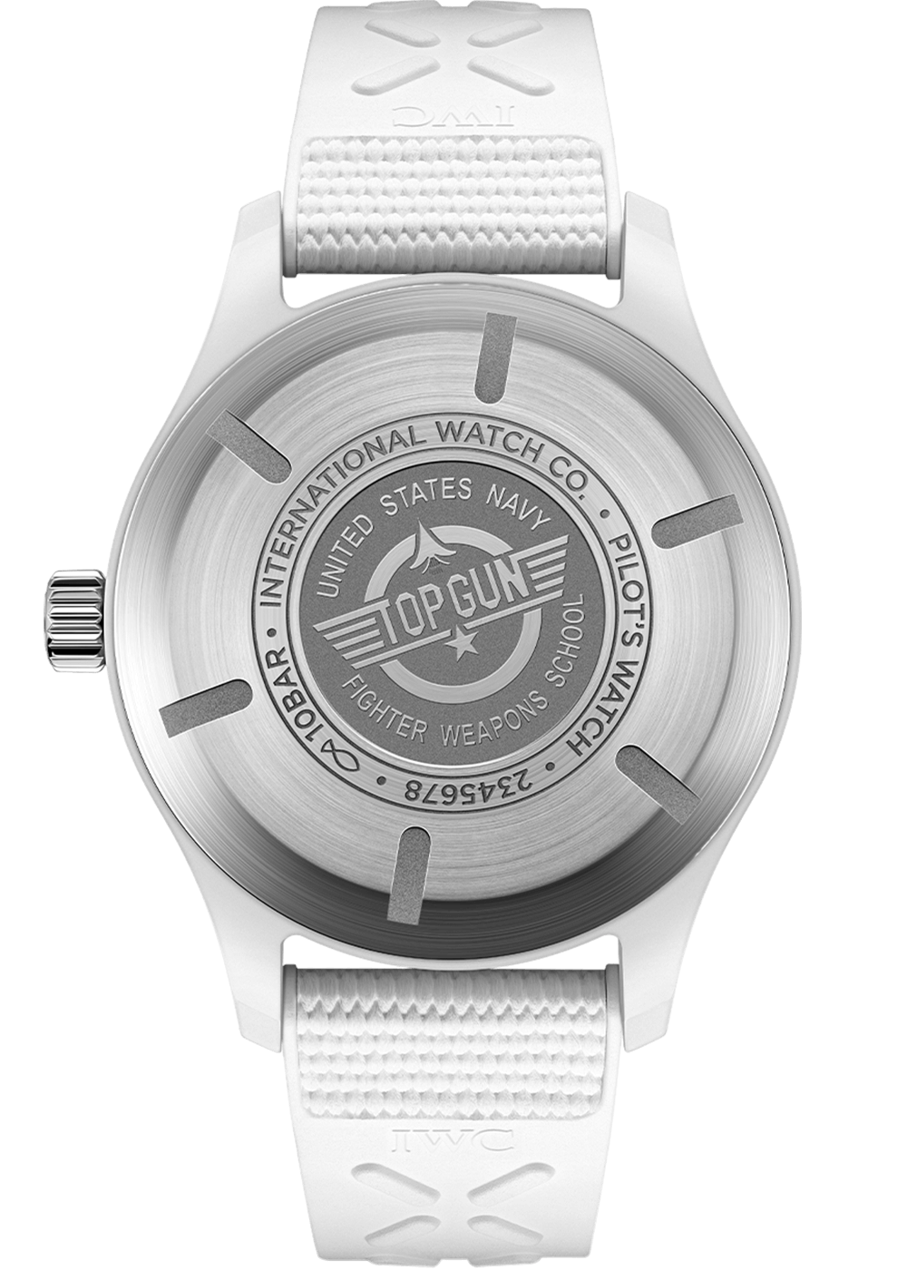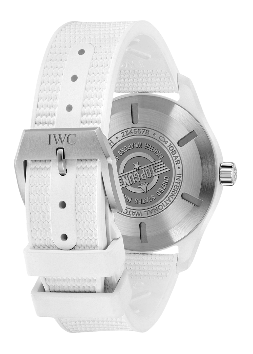 The Pilot’s Watch Automatic 41 TOP GUN Lake Tahoe features a striking 41 mm case made of white ceramic. The ceramic color “Lake Tahoe” is inspired by the wintry landscape surrounding Lake Tahoe – a mountainous region that often serves as a training ground for pilots in the Strike Fighter Tactics Instructor Program (SFTI). The subtle but striking shade of white has established itself as one of IWC Schaffhausen’s most iconic ceramic colors.