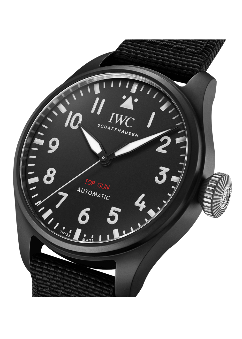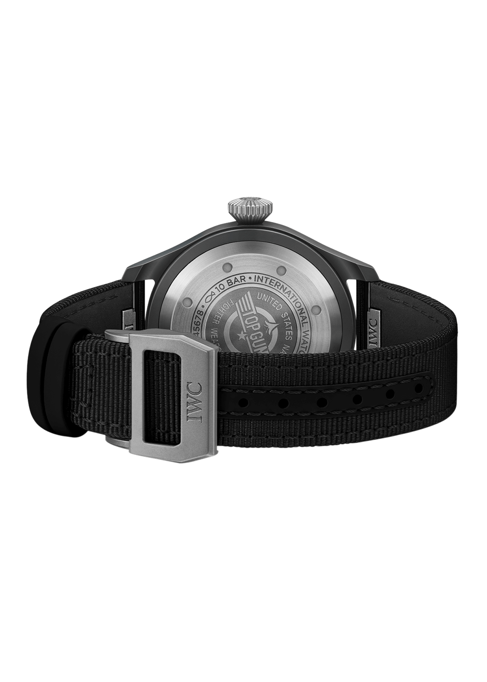 The Pilot’s Watch 43 TOP GUN has a case made of black ceramic, a black dial and a case back and crown made of titanium.