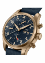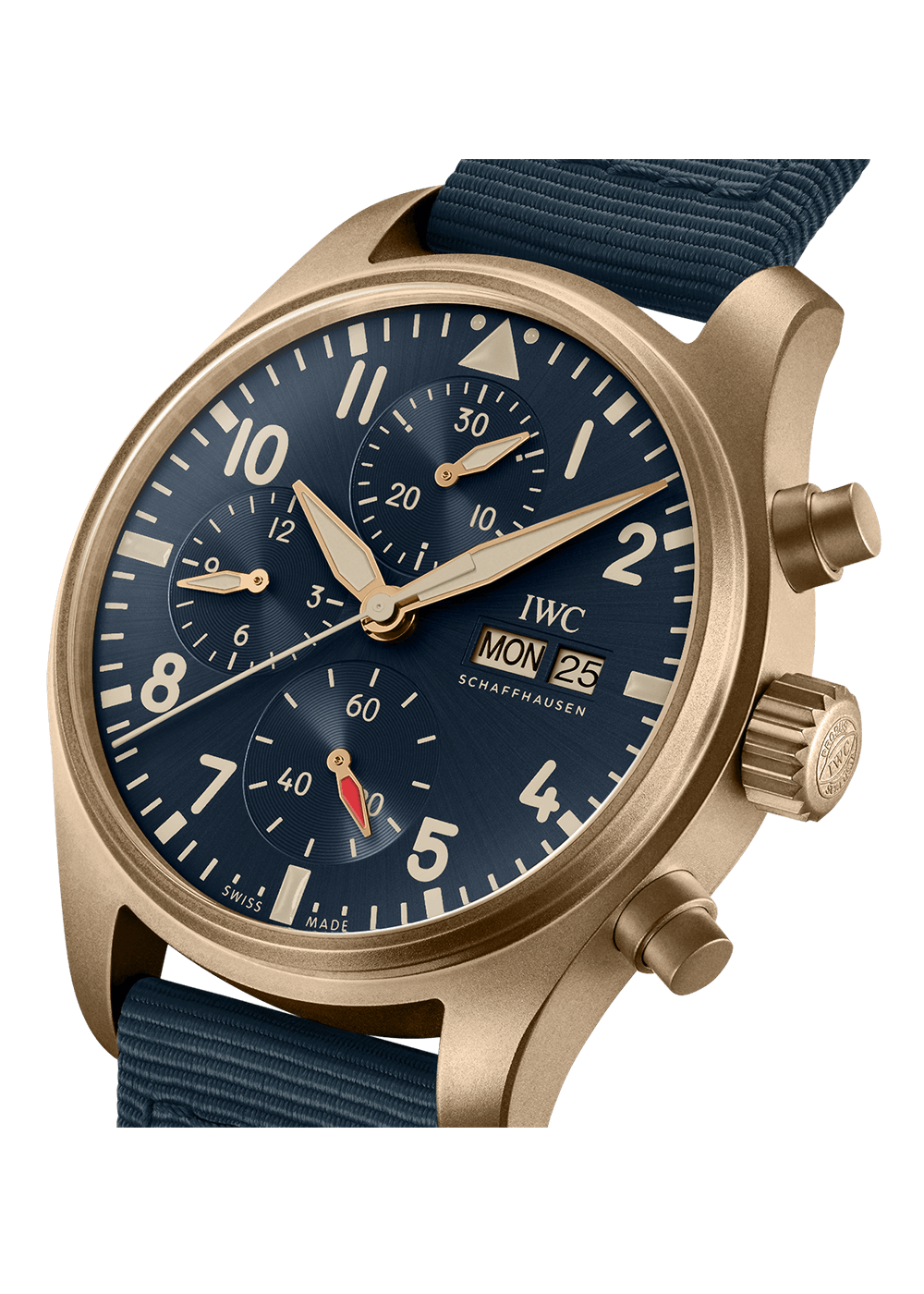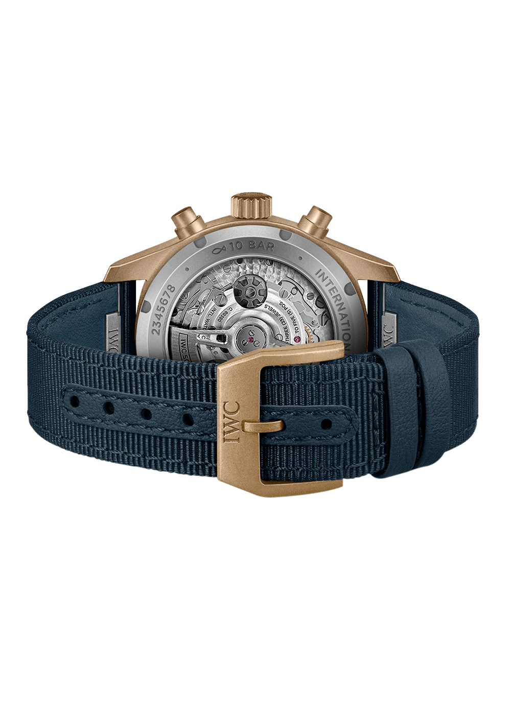 This variant of the Pilot’s Watch Chronograph 41 has a bronze case, crown and push-pieces. The bronze used by IWC contains aluminium and iron as well as copper. This special composition makes the alloy around 50 per cent harder than conventional bronze. An important additional property is the material’s excellent biocompatibility. In addition, bronze develops a unique patina over time, giving each timepiece its own character and appearance.
