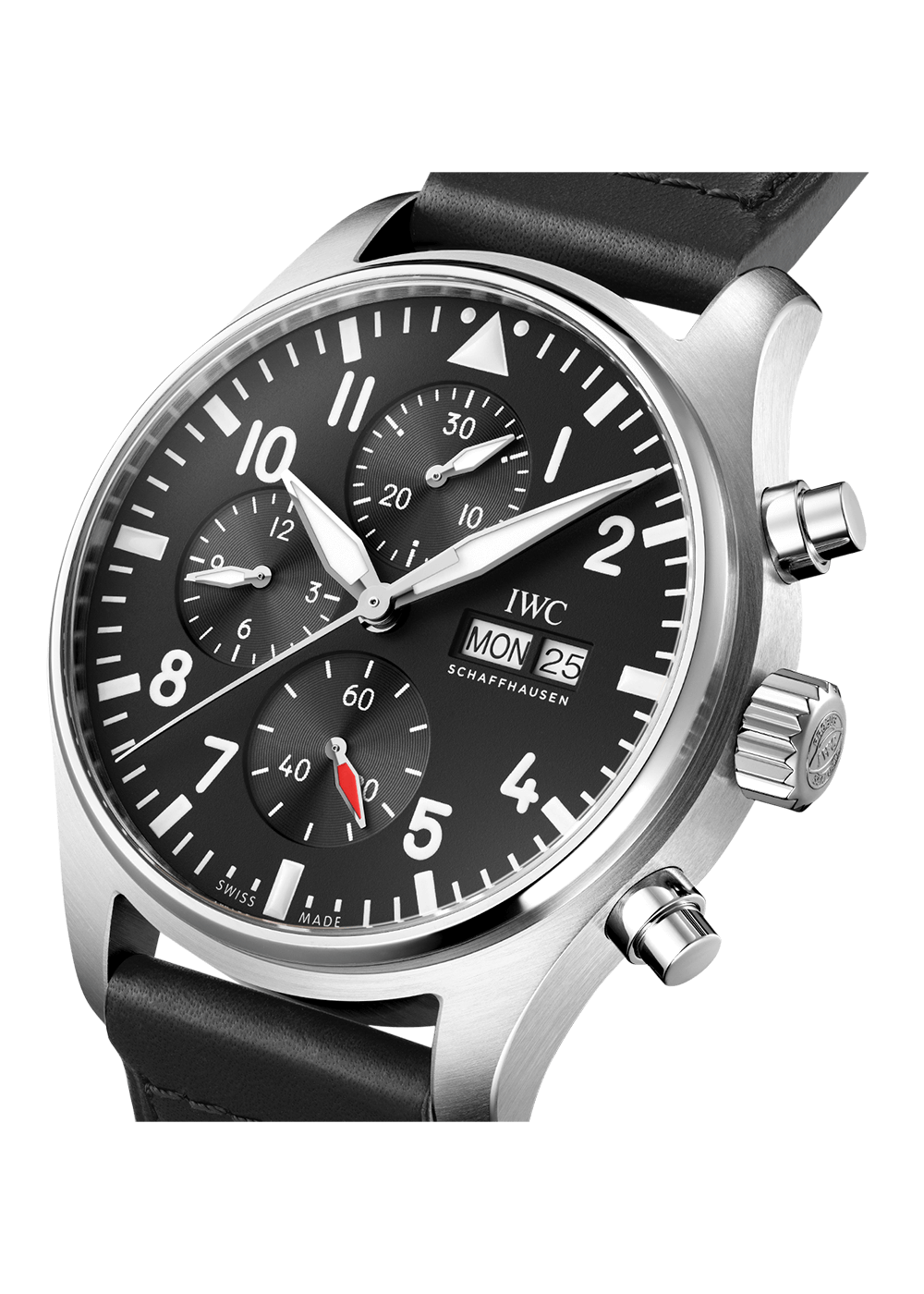 The Pilot’s Watch Chronograph is the epitome of a versatile sports watch and an excellent companion in all situations. The high-contrast dial with its large Arabic numerals and marking triangle at 12 o’clock is designed in the style of an easy-to-read cockpit instrument.
