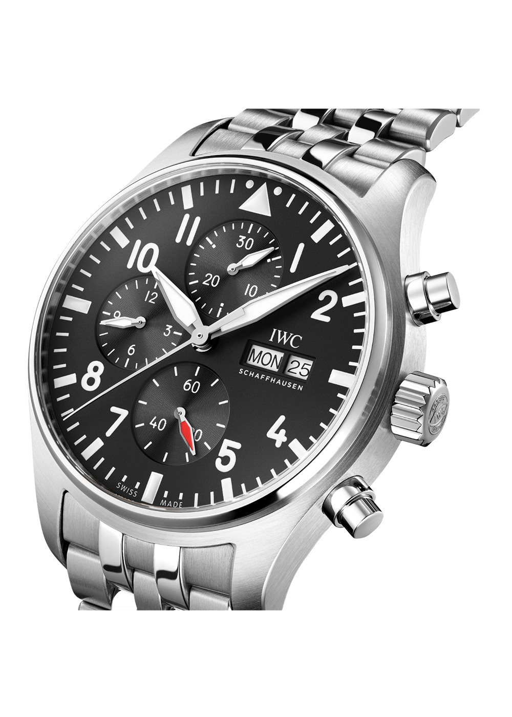 The Pilot’s Watch Chronograph is the epitome of a versatile sports watch and an excellent companion in all situations. The high-contrast dial with its large Arabic numerals and marking triangle at 12 o’clock is designed in the style of an easy-to-read cockpit instrument.