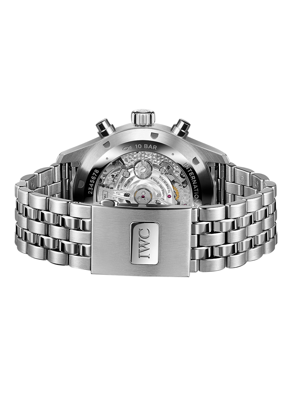 The IWC manufacture calibre 69385, a precise and robust chronograph movement in classic column-wheel design, enables stop or add times to be measured for up to 12 hours. Thanks to the integrated EasX-CHANGE® system, the strap can be changed easily and without additional tools.