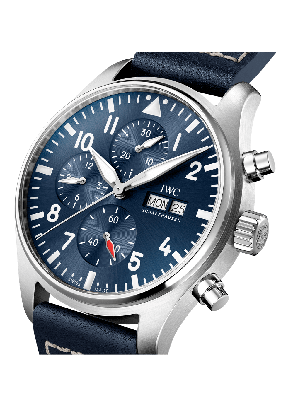 The Pilot’s Watch Chronograph is the epitome of a versatile sports watch and an excellent companion in all situations. The high-contrast dial with its large Arabic numerals and marking triangle at 12 o’clock is designed in the style of an easy-to-read cockpit instrument.