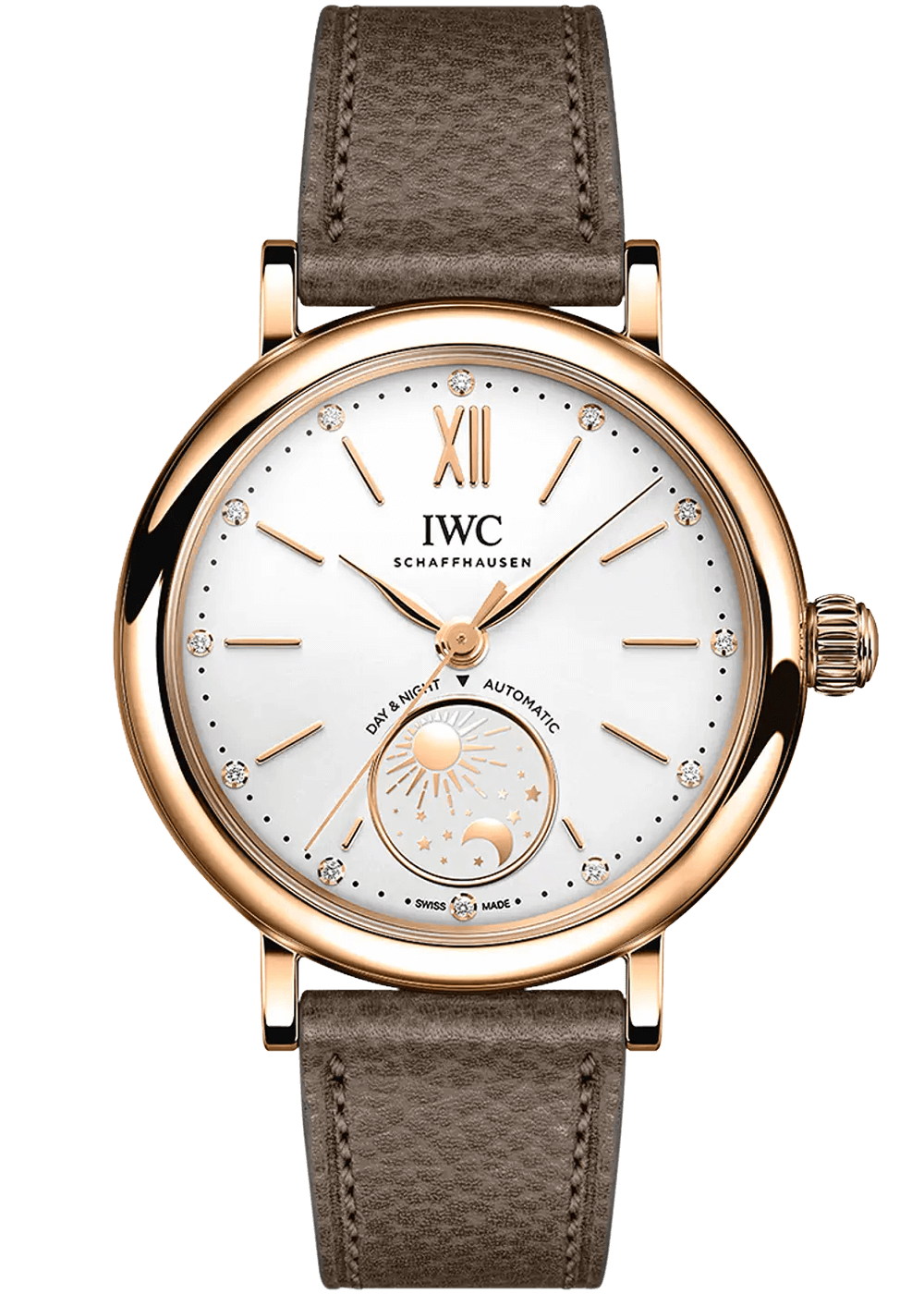 The Portofino Automatic Day & Night 34 features a day and night complication. A small disc at 6 o’clock indicates whether it is currently day or night. At midday or midnight, either the sun or the moon appears in the upper section.