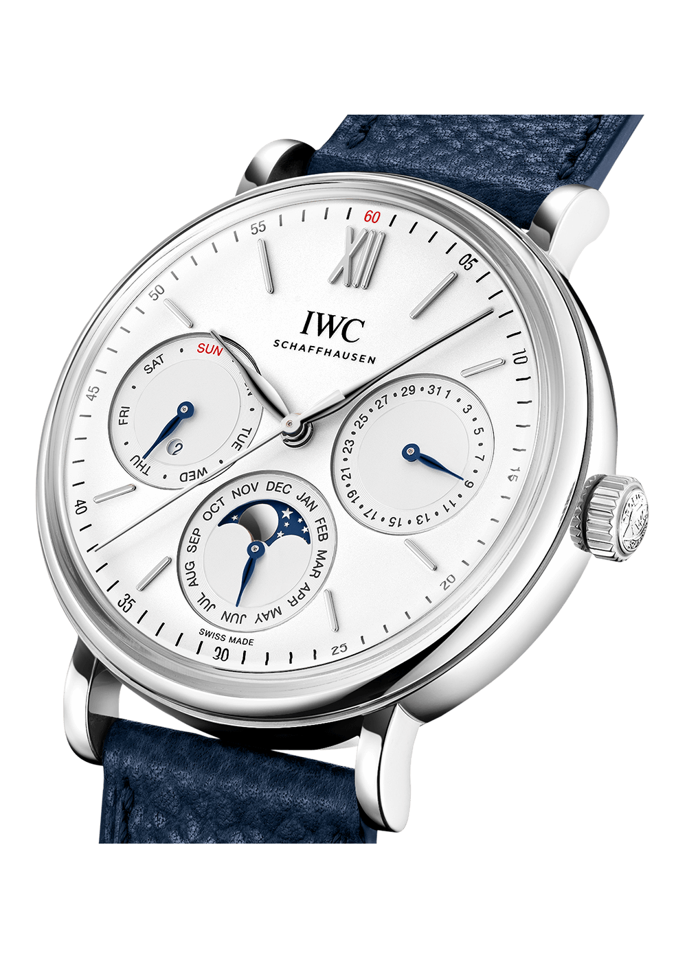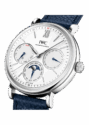 The Portofino Perpetual Calendar is equipped with the legendary perpetual calendar developed by Kurt Klaus in the 1980s. With a diameter of just 40 millimetres, this watch is the smallest perpetual calendar in IWC’s portfolio. This version has a stainless steel case, a silver-plated dial and gold-plated hands and appliqués.