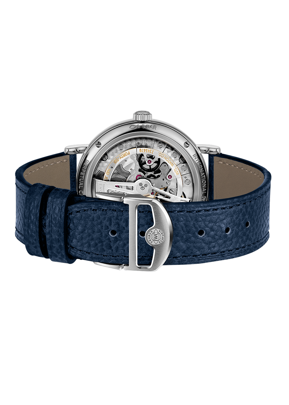 The sophisticated mechanism is mechanically programmed to recognise the different lengths of the months as well as the leap years. It runs completely autonomously, without any manual adjustments, until the year 2100. The IWC Manufacture calibre 82650 can be viewed through a transparent case back.