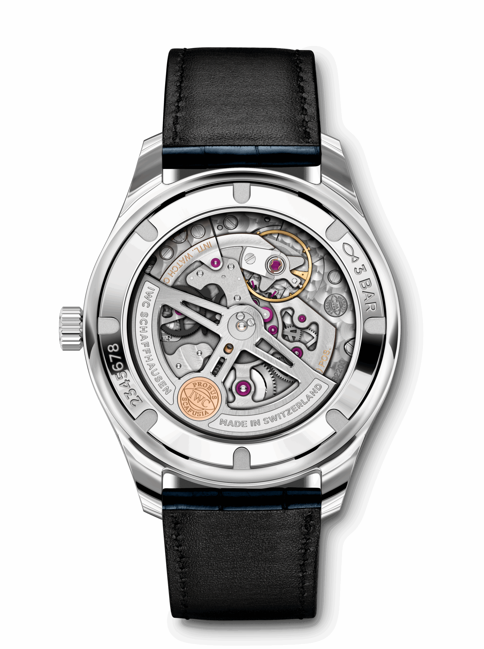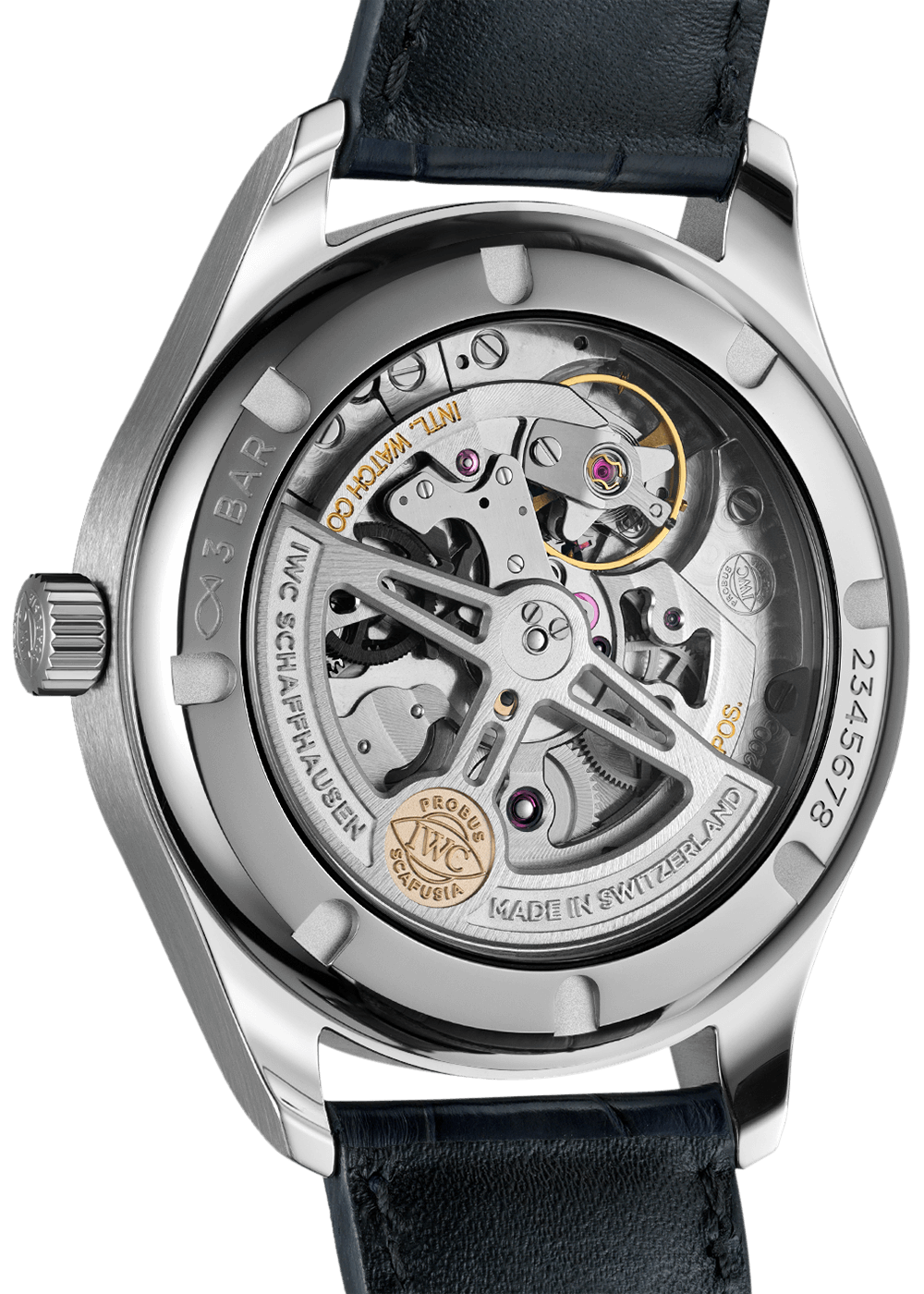The precise automatic movement is based on IWC’s Manufacture Calibre 82200 and is distinguished not only by its accuracy but also by its robustness. The Pellaton winding mechanism is made of ceramic components that operate wear-free and offer a power reserve of up to 60 hours. The impressive movement can be viewed through the sapphire crystal back.