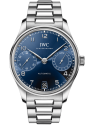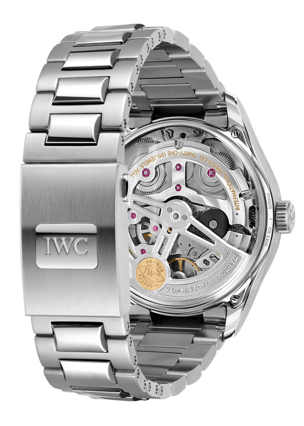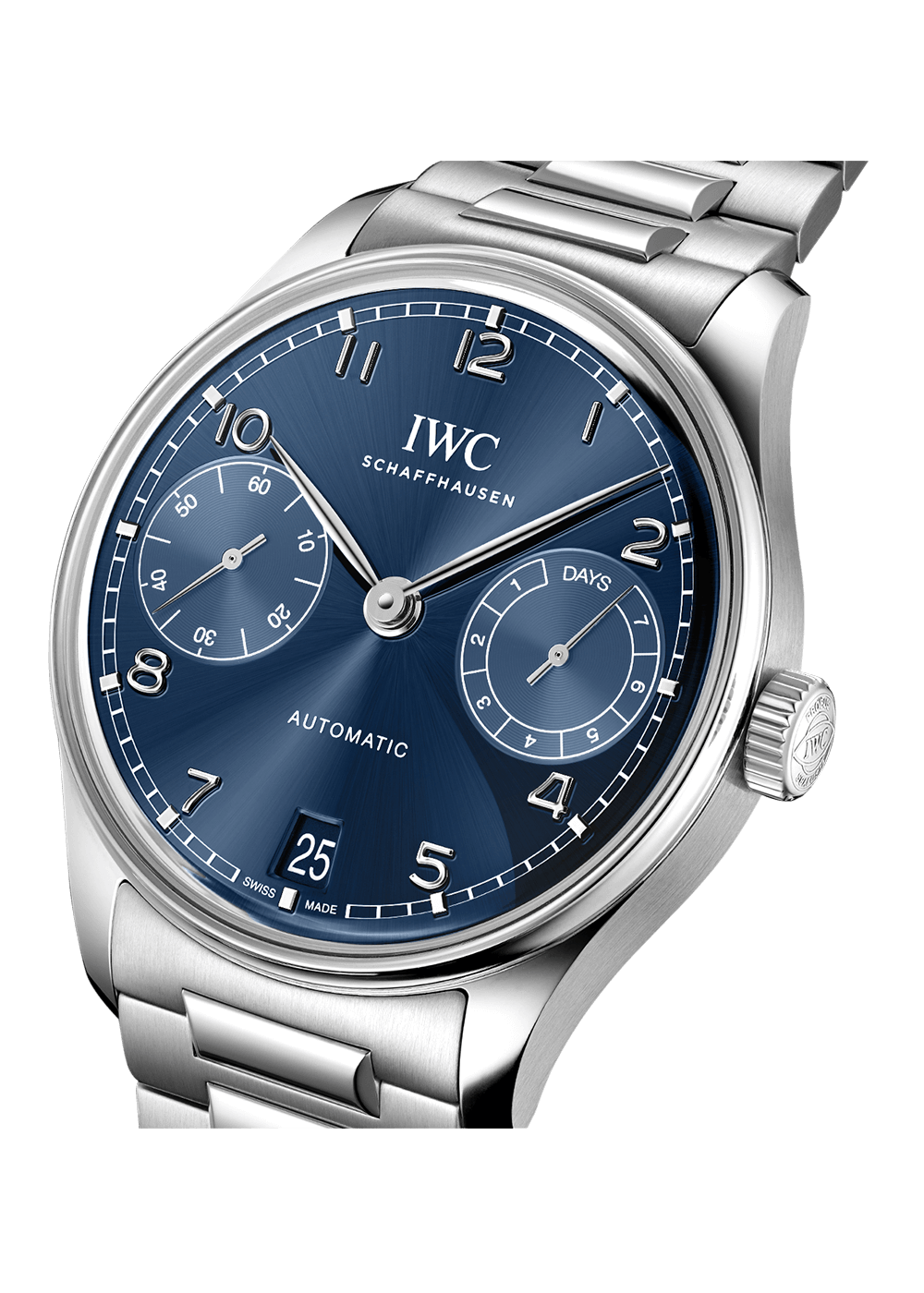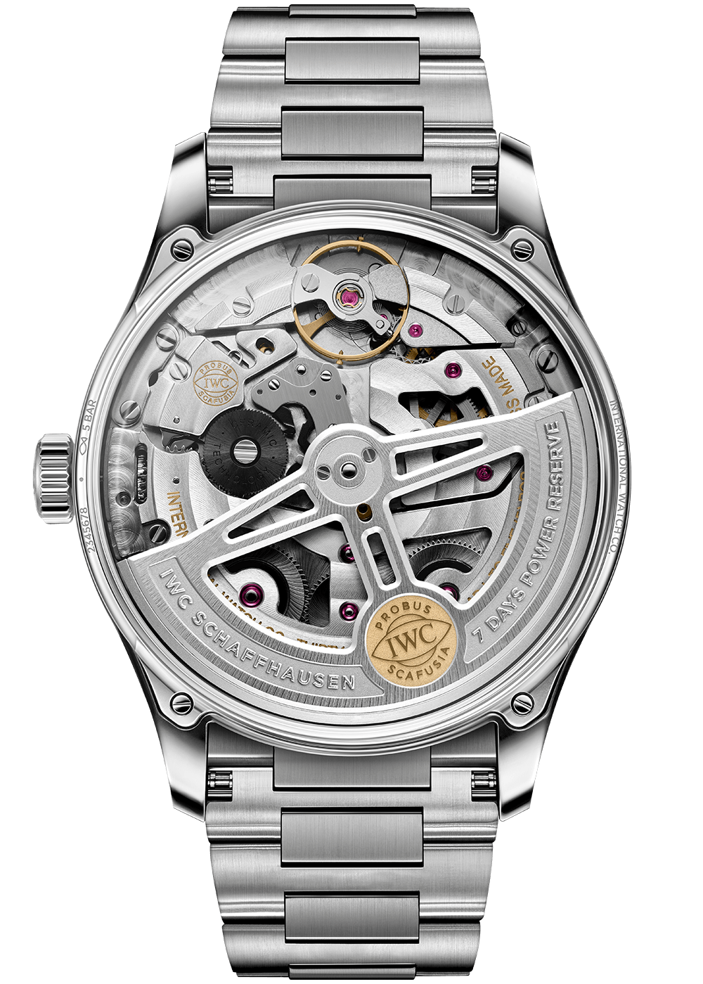 The Portugieser Automatic 42 is powered by the IWC-manufactured 52011 caliber, which is elaborately finished with circular Côtes de Genève. The Pellaton winding system is reinforced with virtually wear-free zirconium oxide ceramic components and builds up a power reserve of seven days (168 hours) in two barrels.