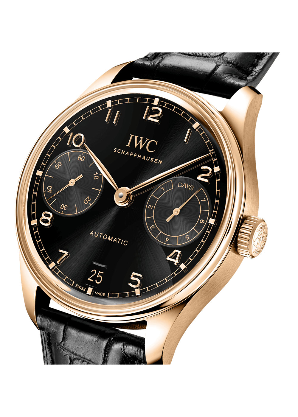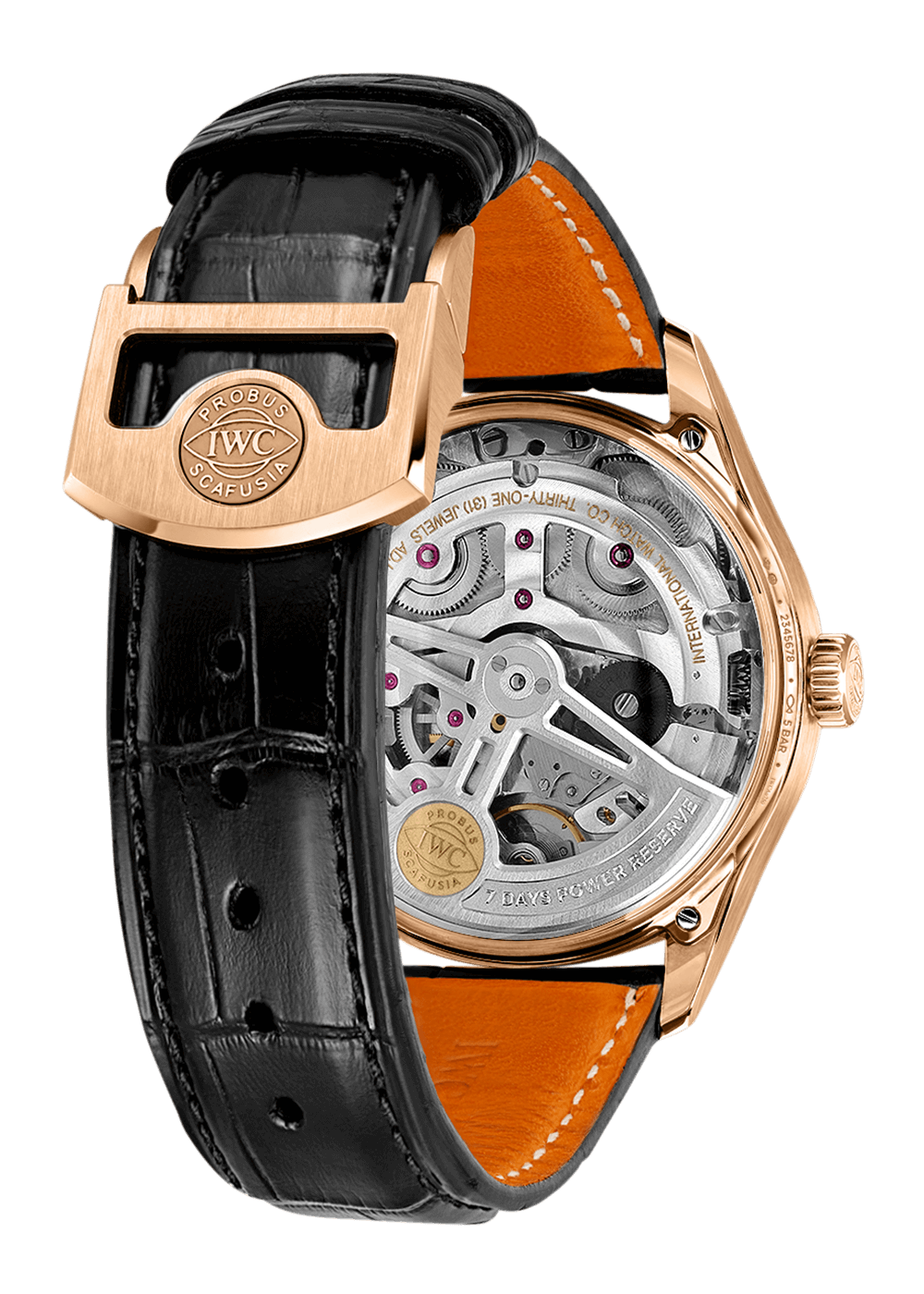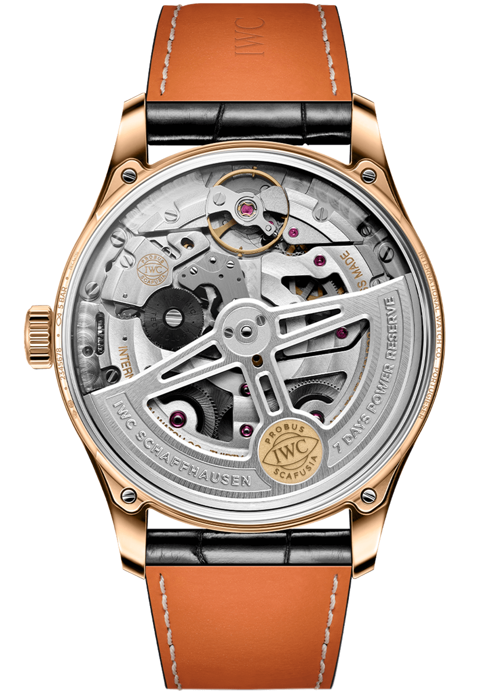 The Portugieser Automatic 42 is powered by the IWC-manufactured 52011 caliber, which is elaborately finished with circular Côtes de Genève. The Pellaton winding system is reinforced with virtually wear-free zirconium oxide ceramic components and builds up a power reserve of seven days (168 hours) in two barrels.