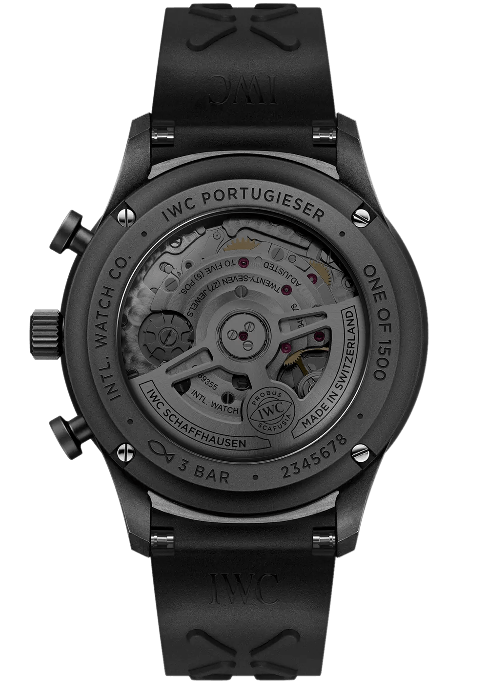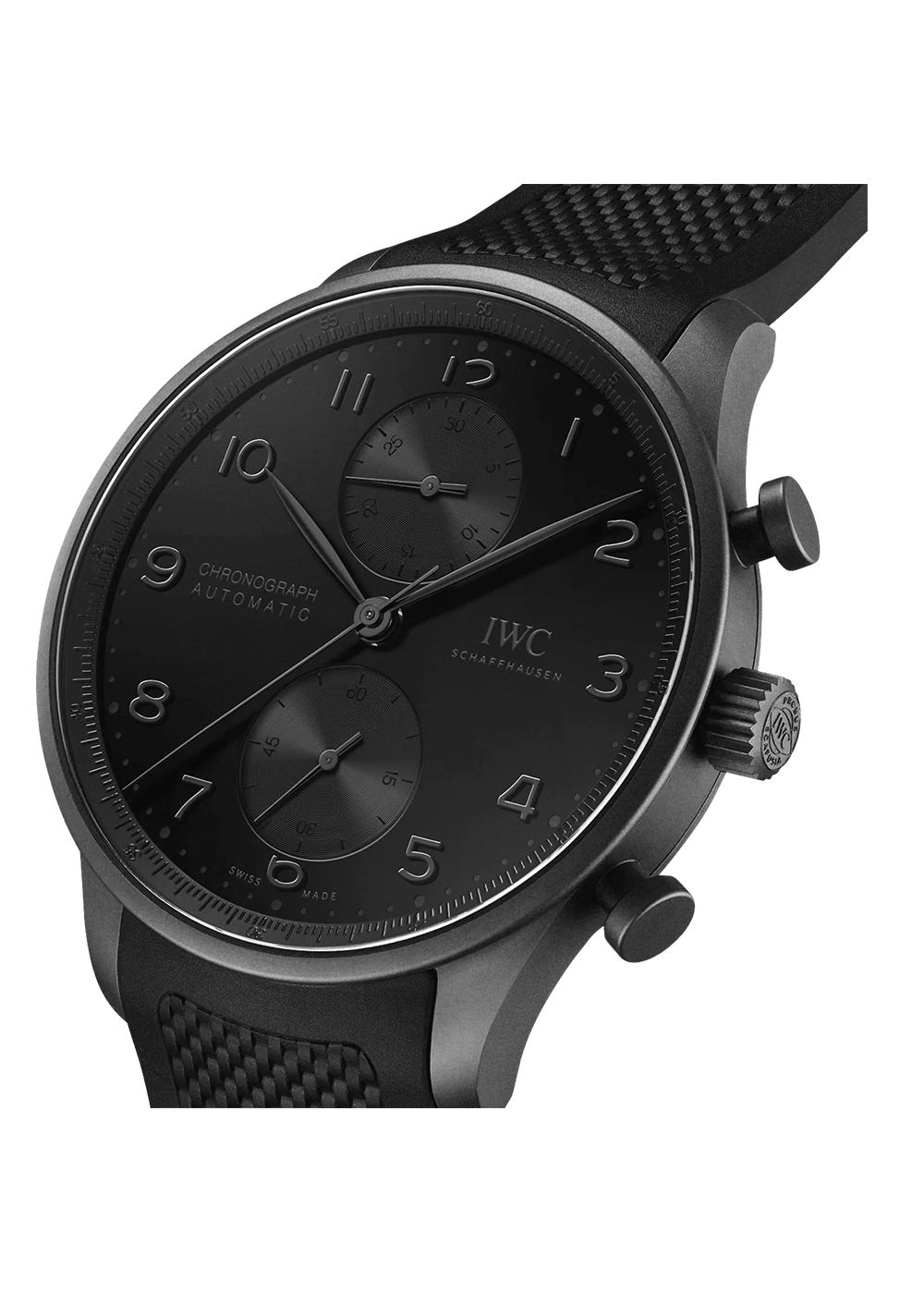 Experience a creative reinterpretation: the Portugieser Chronograph Ceratanium® introduces the innovative, matt black high-tech material to the legendary Portugieser collection for the first time. The monolithic design captivates with its strikingly understated aesthetic. From the deep black dial and matching hour markers and hands to the textured rubber strap – this timepiece sets new standards for all-black watches in the luxury segment.