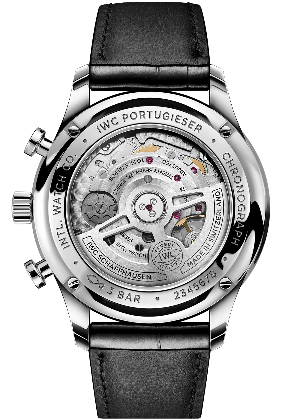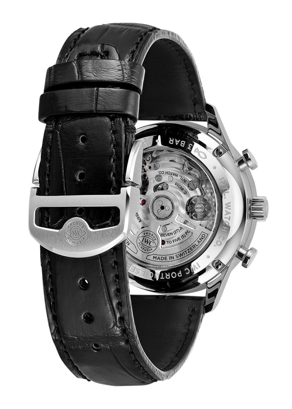 Since 1998, the Portugieser Chronograph has brought a sporty and elegant touch to the Portugieser collection from IWC Schaffhausen. The vertical arrangement of the sub-dials, typical of IWC, shows the stopped minutes directly at 12 o’clock and places the small seconds at 6 o’clock. This arrangement improves readability and has made the Portugieser Chronograph a design icon. Another feature is the réhaut printed with a quarter-second scale, which ensures precise reading of the stop time.