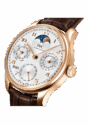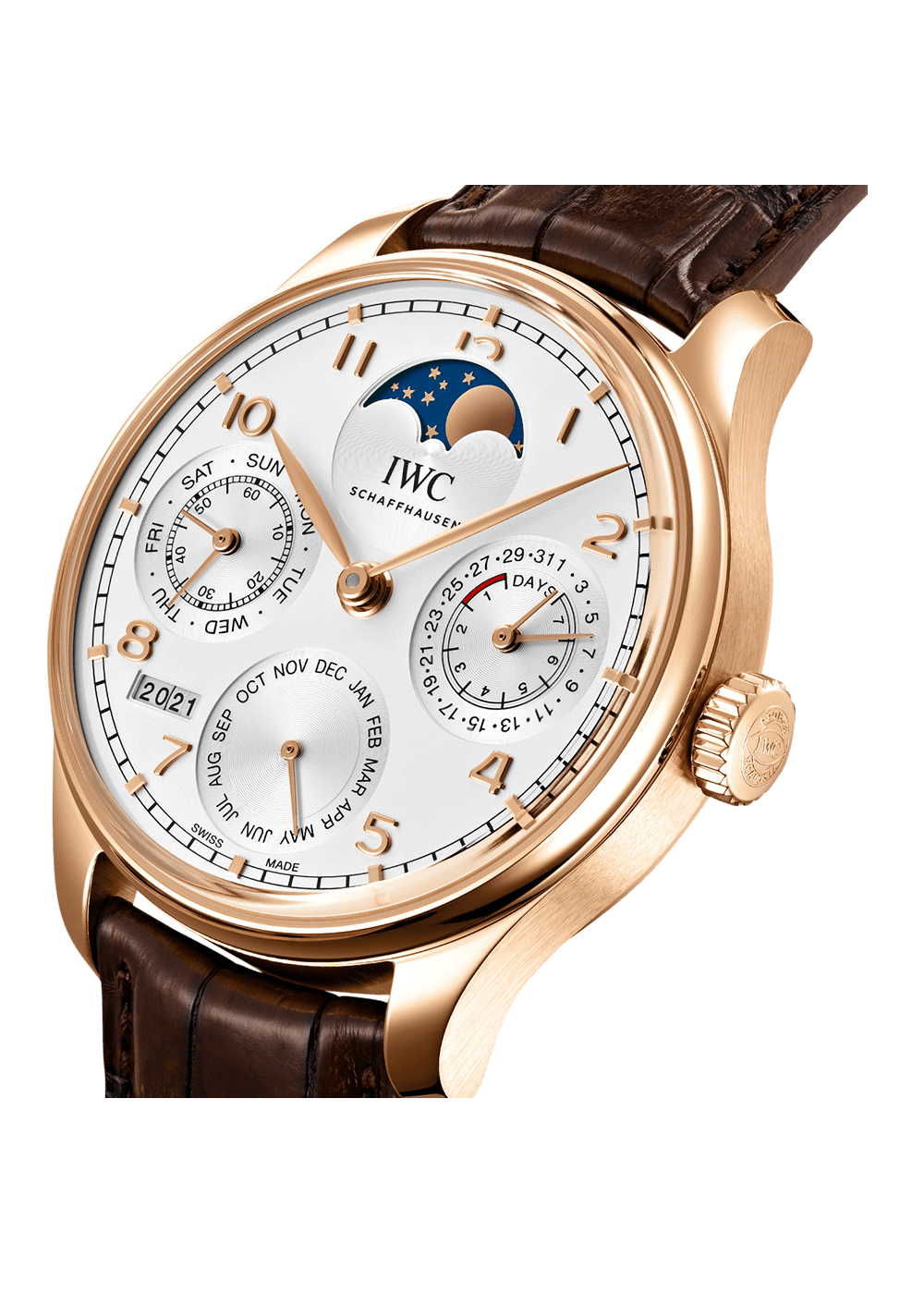 The moon phase display on the Portugieser Perpetual Calendar diverges by just 1 day in 577.5 years from the actual phase of the moon. The elegant timepiece leaves virtually no wish unfulfilled. It is equipped with features such as a perpetual calendar, a window showing the year in four digits and a 7-day automatic movement with Pellaton winding. The four subdials on the silver-plated dial display the phase of the moon, the date, month and day, the power reserve and the small seconds.