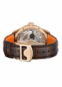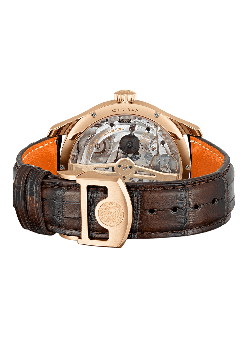 This timepiece is powered by an IWC-manufactured movement from the 52000-calibre family, featuring a solid red gold rotor and blued screws. The 18-carat red gold watch has an arched-edge front glass and comes with a dark brown alligator leather strap.