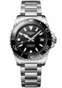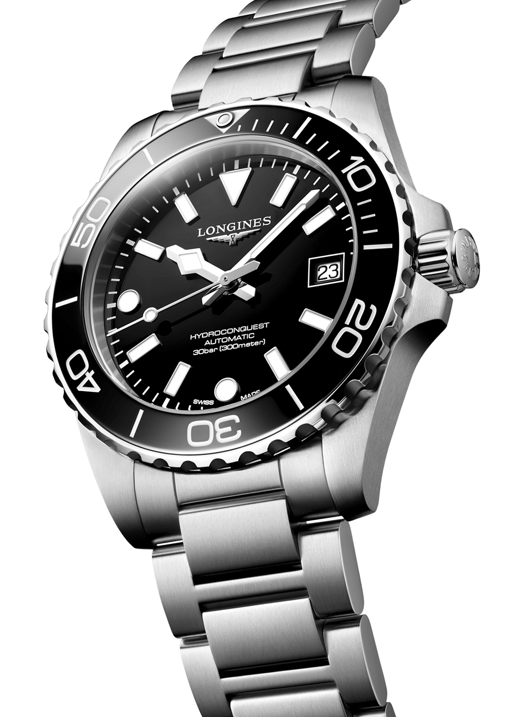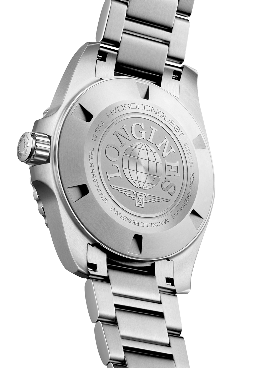 The HYDROCONQUEST collection combines modern aesthetics with proven performance. Powered by an exclusive LONGINES caliber, water-resistant to 30 bar (300 m), with a unidirectional rotating bezel, a screw-down crown, and a screw-down case back.
