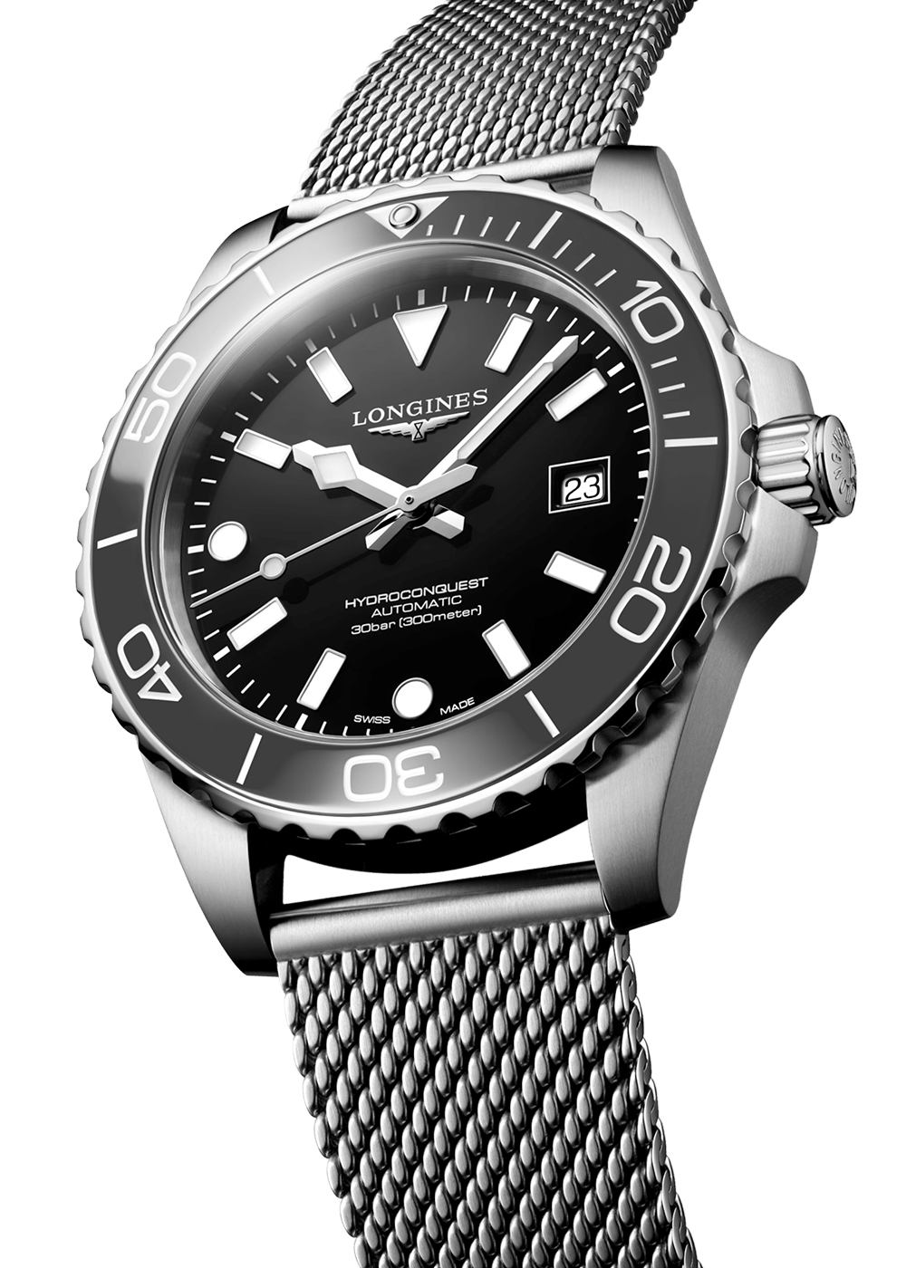 The HYDROCONQUEST collection combines modern aesthetics with proven performance. Powered by an exclusive LONGINES caliber, water-resistant to 30 bar (300 m), with a unidirectional rotating bezel, a screw-down crown, and a screw-down case back.