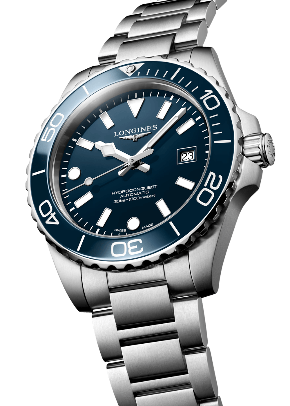 The HYDROCONQUEST collection combines modern aesthetics with proven performance. Powered by an exclusive LONGINES caliber, water-resistant to 30 bar (300 m), with a unidirectional rotating bezel, a screw-down crown, and a screw-down case back.
