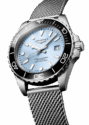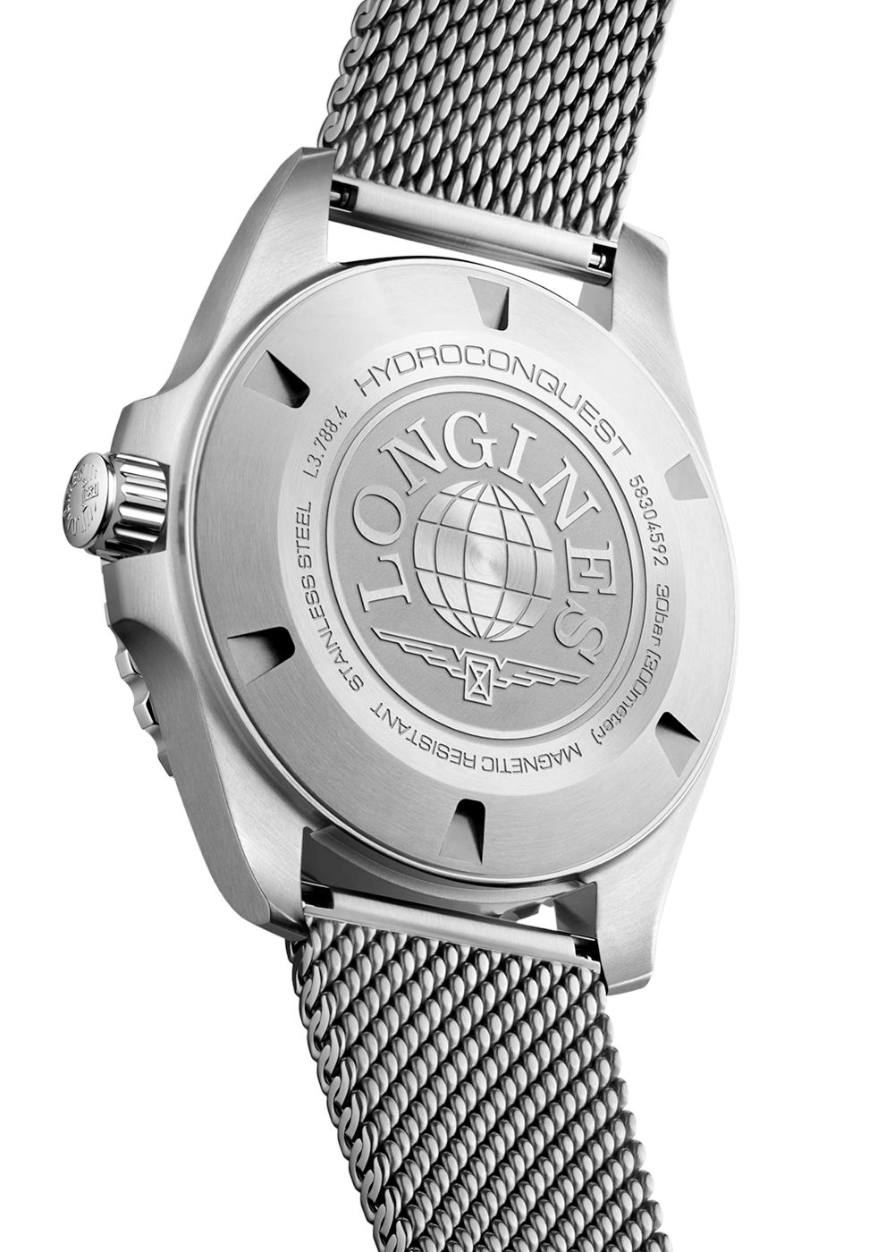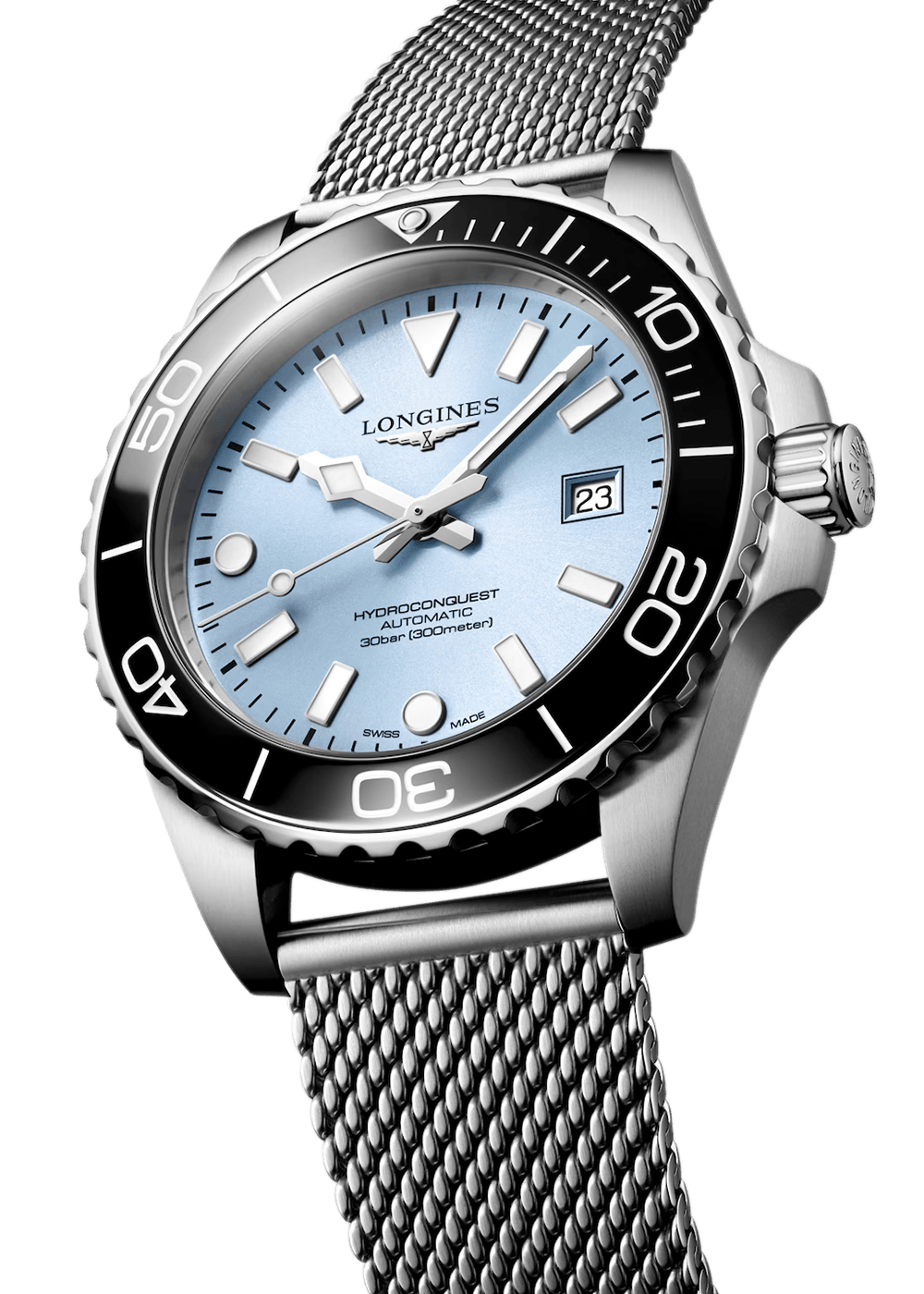 The HYDROCONQUEST collection combines modern aesthetics with proven performance. Powered by an exclusive LONGINES caliber, water-resistant to 30 bar (300 m), with a unidirectional rotating bezel, a screw-down crown, and a screw-down case back.