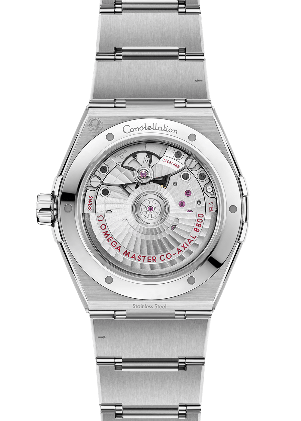 At the heart of this timepiece is the OMEGA Co-Axial Master Chronometer Calibre 8800, visible through the domed scratch-resistant sapphire crystal.