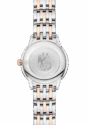 This 27.5 mm model in stainless steel and 18 K Sedna™ gold features a silver dial with a sunray finish and varying vertical embossing. The display is characterised by PVD-coated Sedna™ gold hands and alternating Roman numerals and cabochon indices. The simple look of the timepiece is complemented by a solid case back embossed with the god Chronos.