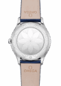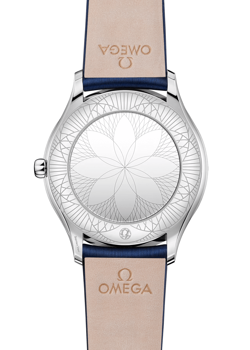The lacquered white dial includes unique transferred Roman numerals in blue and elegant blued hands. The watch is driven by the OMEGA calibre 4061, which sits behind a special mirrored caseback with a “Her Time” pattern. Finally, the watch is presented on a blue fabric strap.