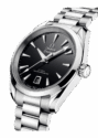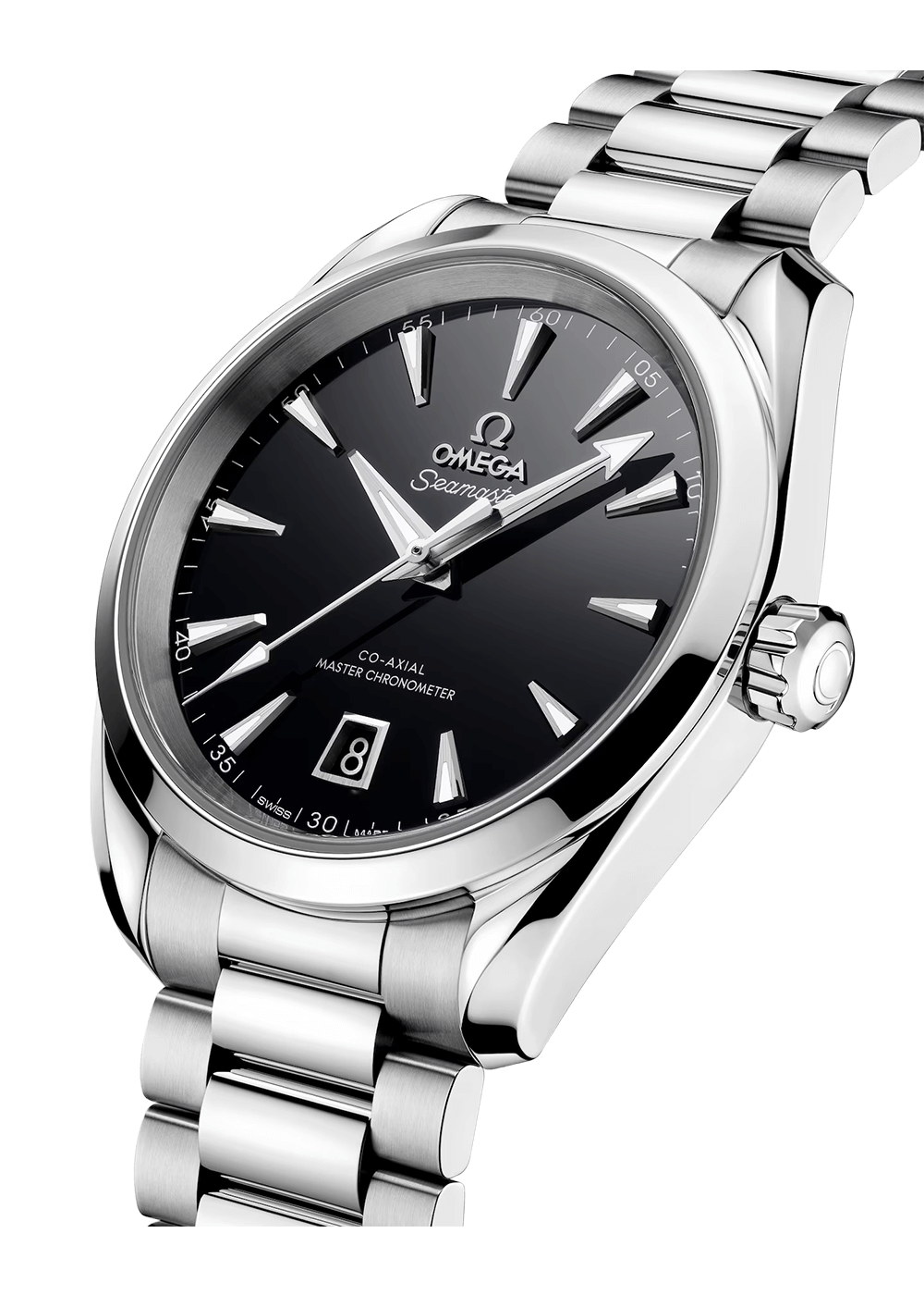 The black lacquered dial features a rhodium-plated, diamond-polished OMEGA logo and a date window at 6 o’clock. The rhodium-plated hands and hour indices are filled with white Super-LumiNova, which glows blue in the dark.