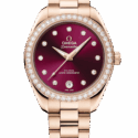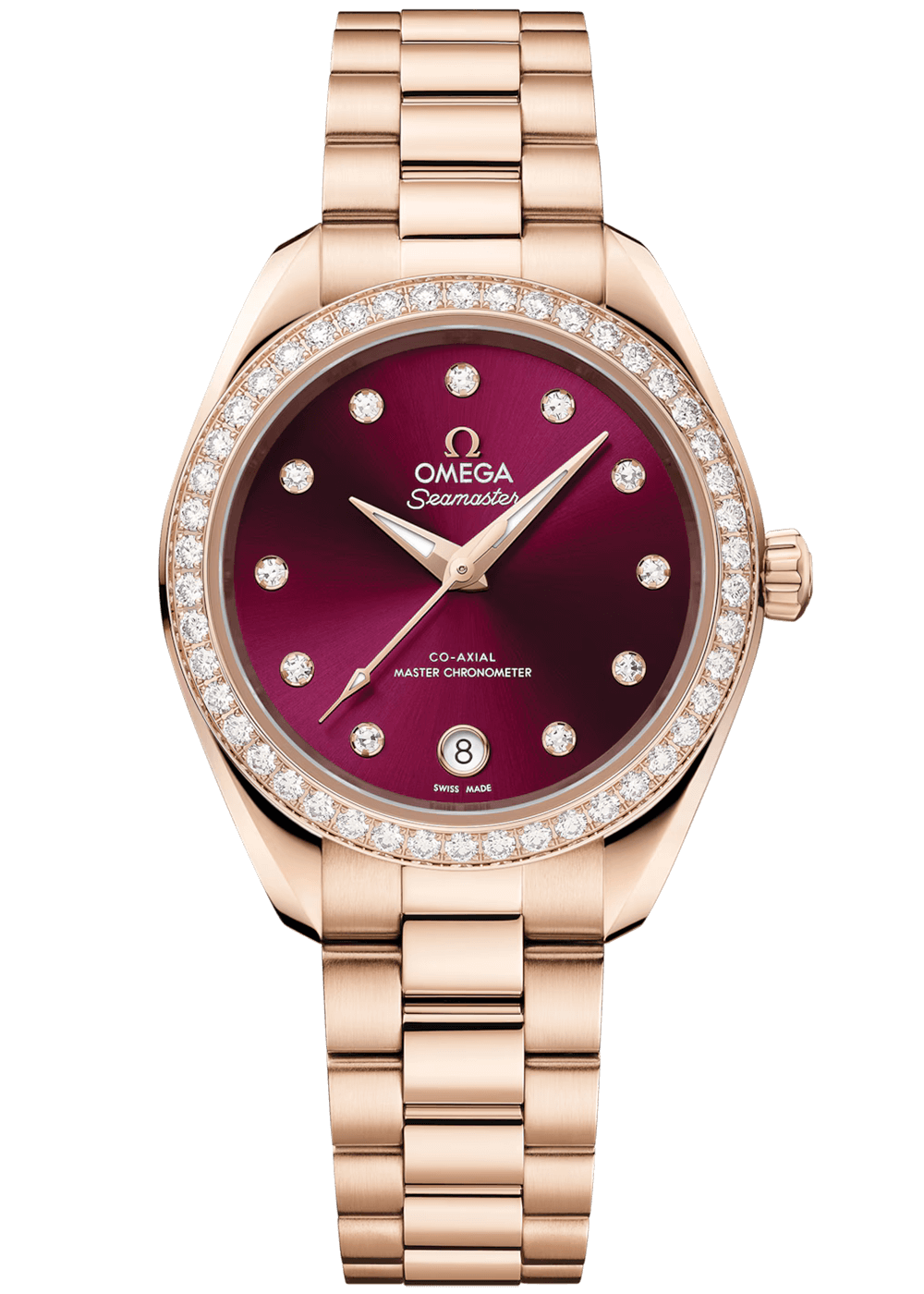 The model features a symmetrical polished 18K Sedna™ gold case, a polished bezel set with 46 diamonds and a screw-in caseback with a wave motif.