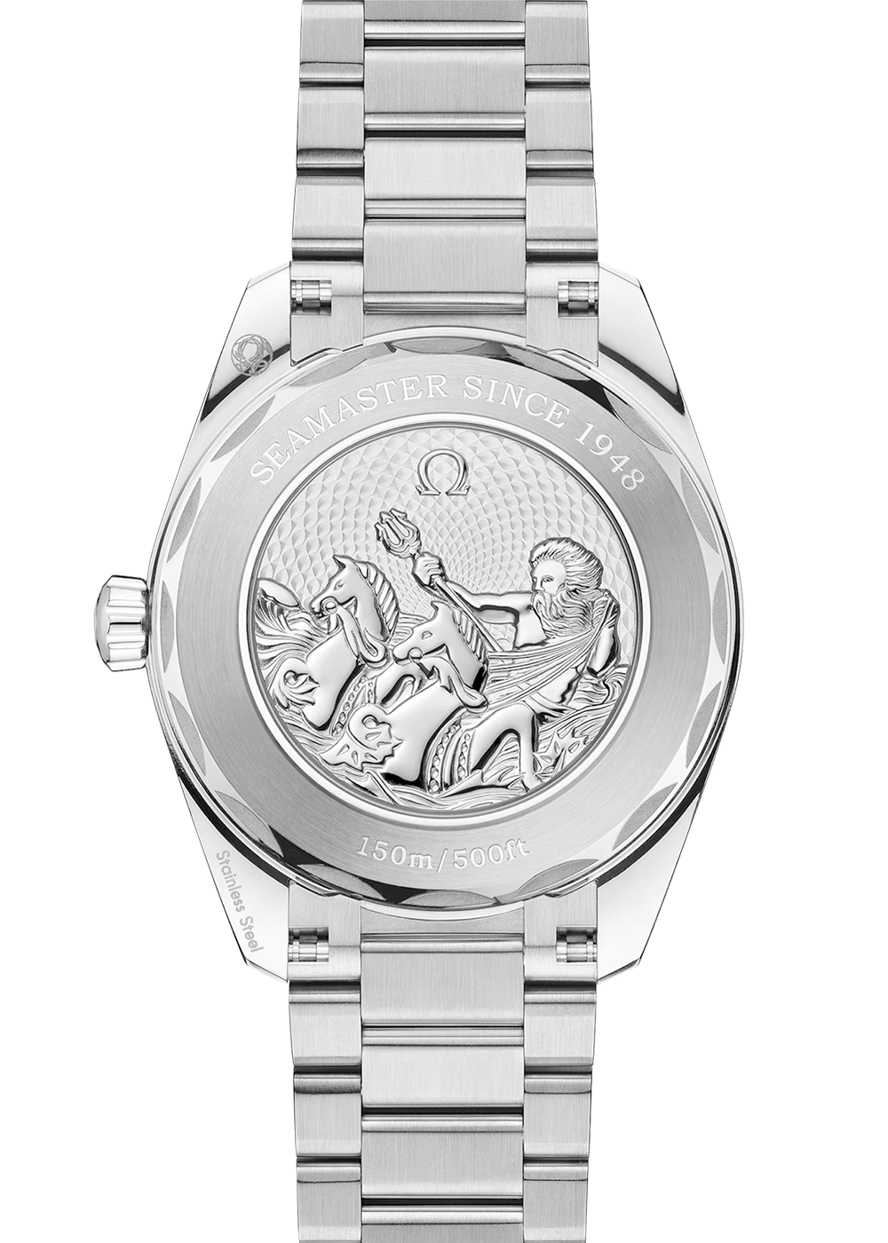 On the back of the watch is an embossed commemorative Seamaster logo showing a Poseidon with a trident and two seahorses: OMEGA’s original 1956 design and current brand emblem. Behind it is OMEGA’s Co-Axial Master Chronometer Calibre 8800, certified by the Swiss Federal Institute of Metrology (METAS) to the highest standards in the industry.