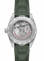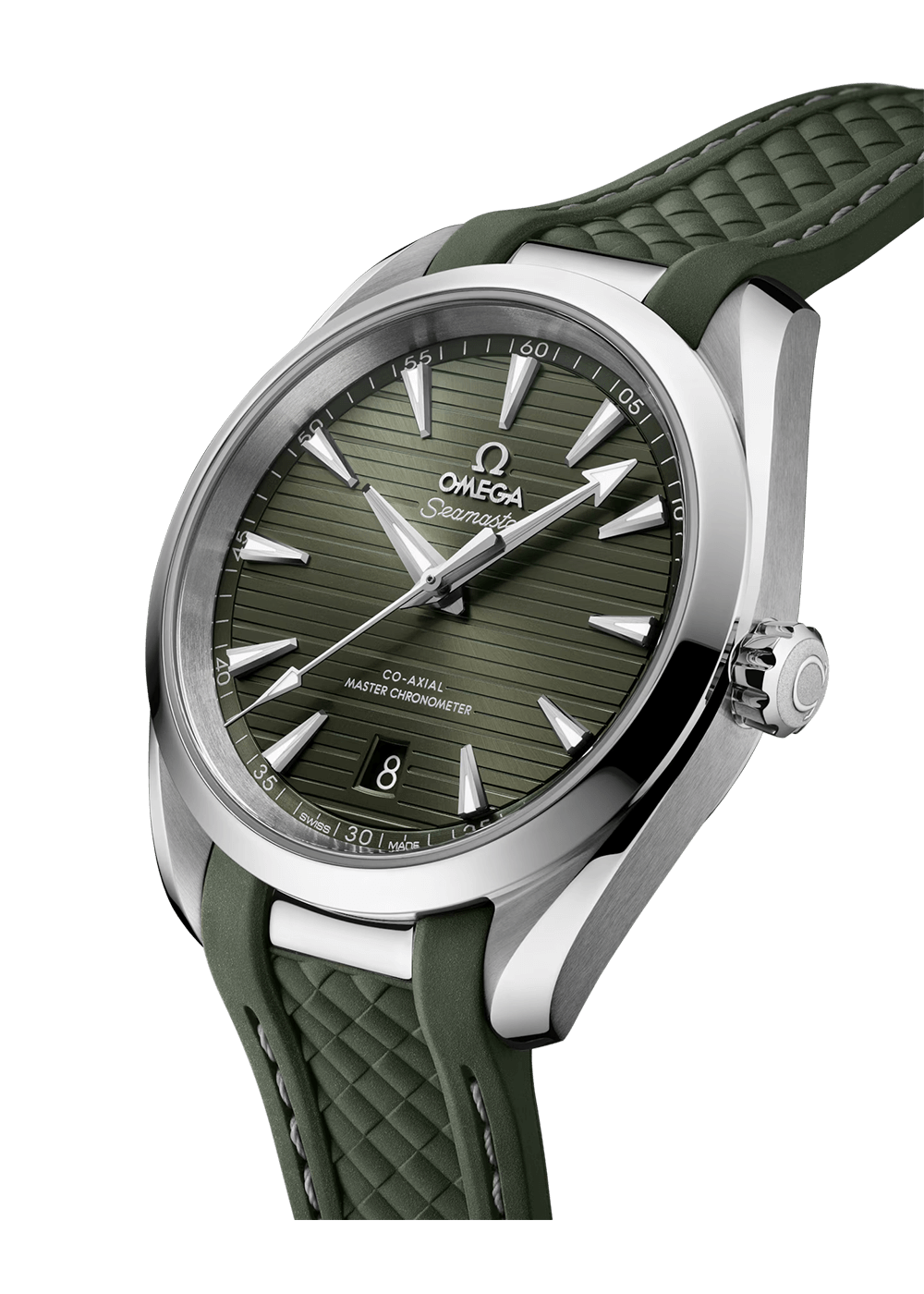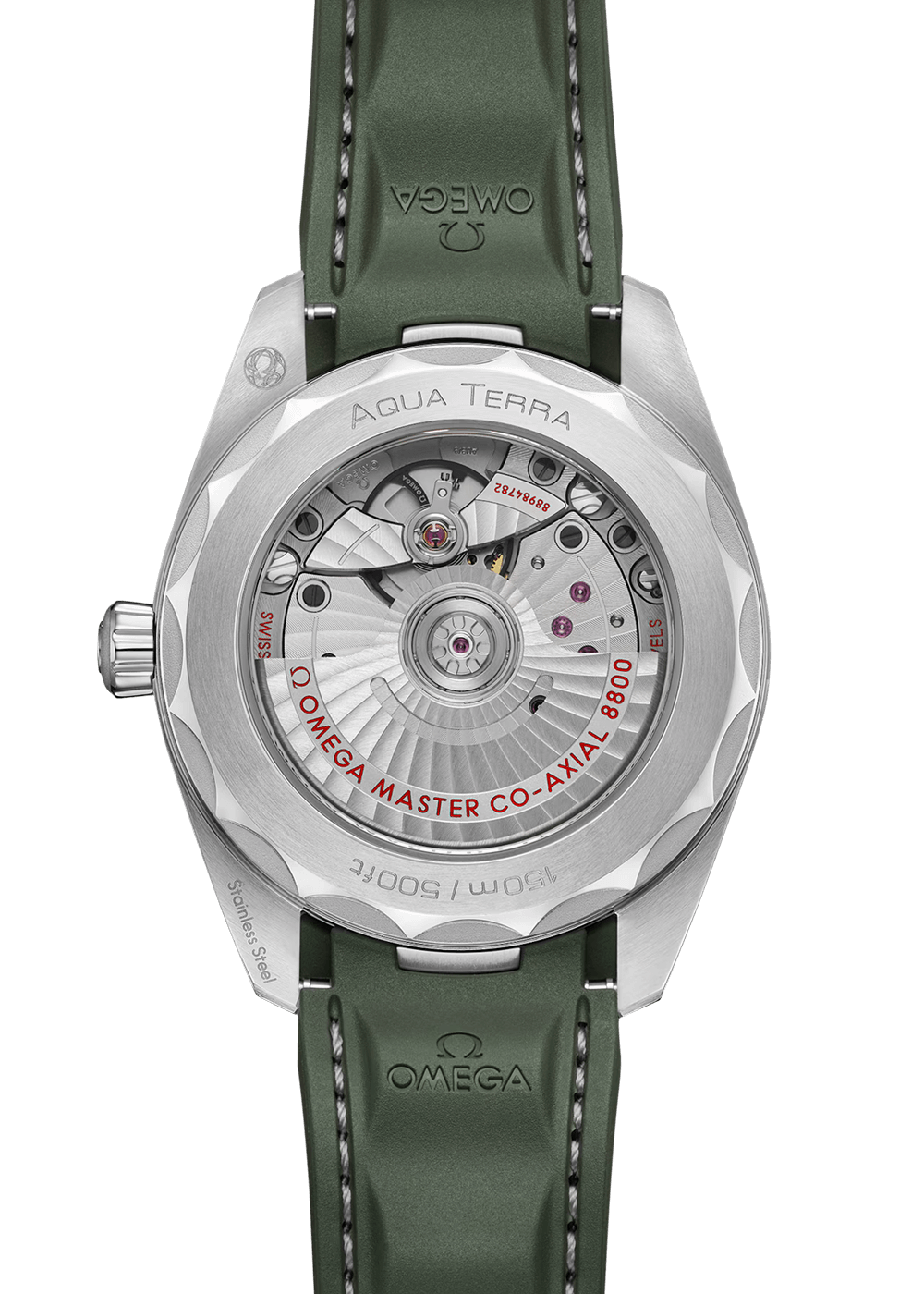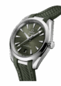 Held on the wrist by an integrated green textured rubber strap with gray stitching and a polished and brushed folding clasp, the watch is powered by the OMEGA Master Chronometer Caliber 8800, which is certified by the Swiss Federal Institute of Metrology (METAS) and meets the highest industry standards.