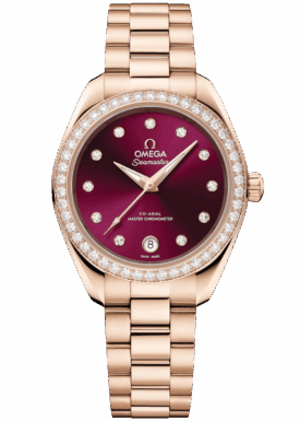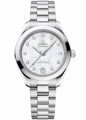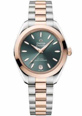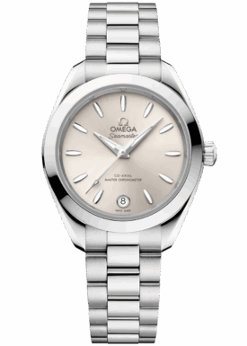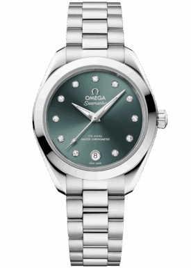 The sunburst dial in OMEGA’s own Summer Blue features a colour gradient that symbolises the watch’s water-resistance. The vertical “teak” stripes and rhodium-plated hands and indices are filled with a unique light blue Super-LumiNova.