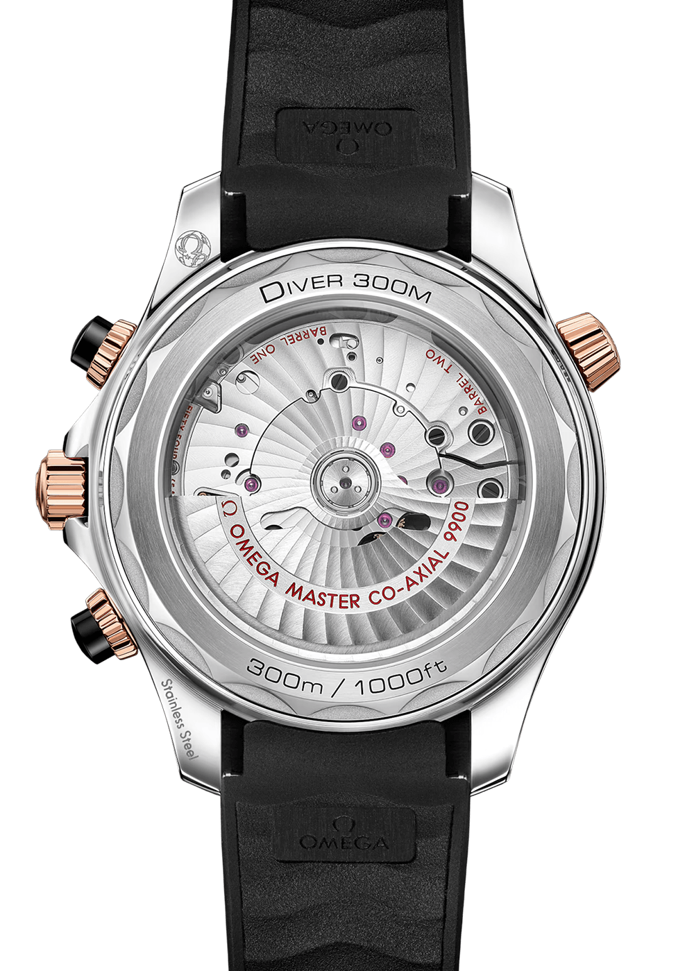 The watch is presented on a black rubber strap and is driven by the OMEGA Master Chronometer Calibre 9900, which can be seen through the sapphire-crystal on the wave-edged caseback.