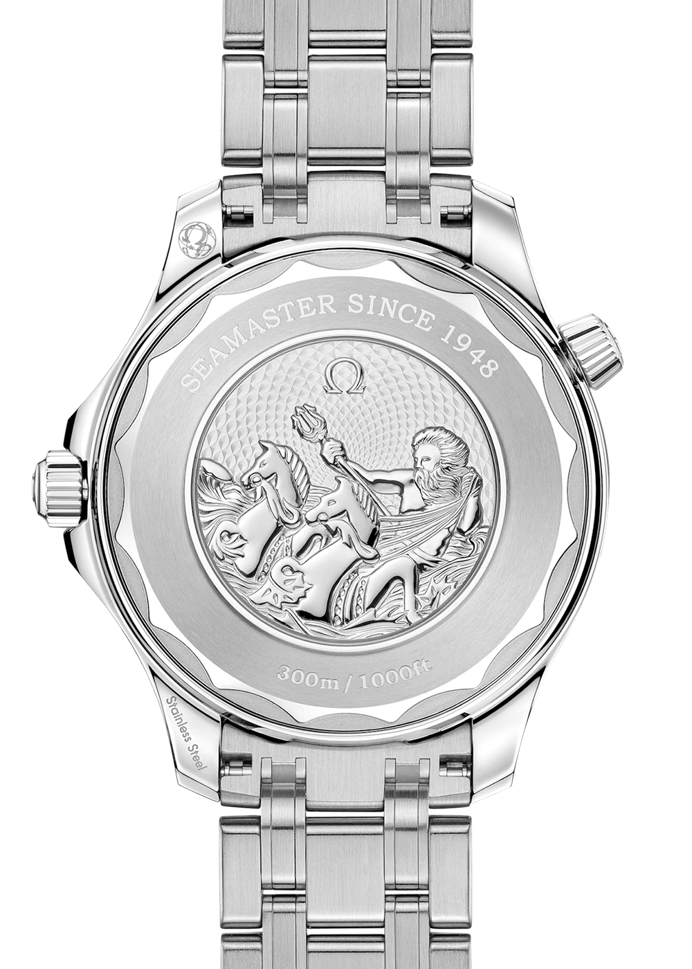 Turning the watch over reveals an embossed commemorative Seamaster logo featuring a trident-bearing Poseidon and two seahorses: OMEGA’s 1956 original and the brand’s current design. Behind it is OMEGA’s Co-Axial Master Chronometer Calibre 8800, certified to the highest standard by the Swiss Federal Institute of Metrology (METAS).