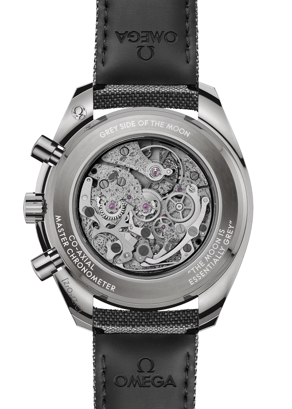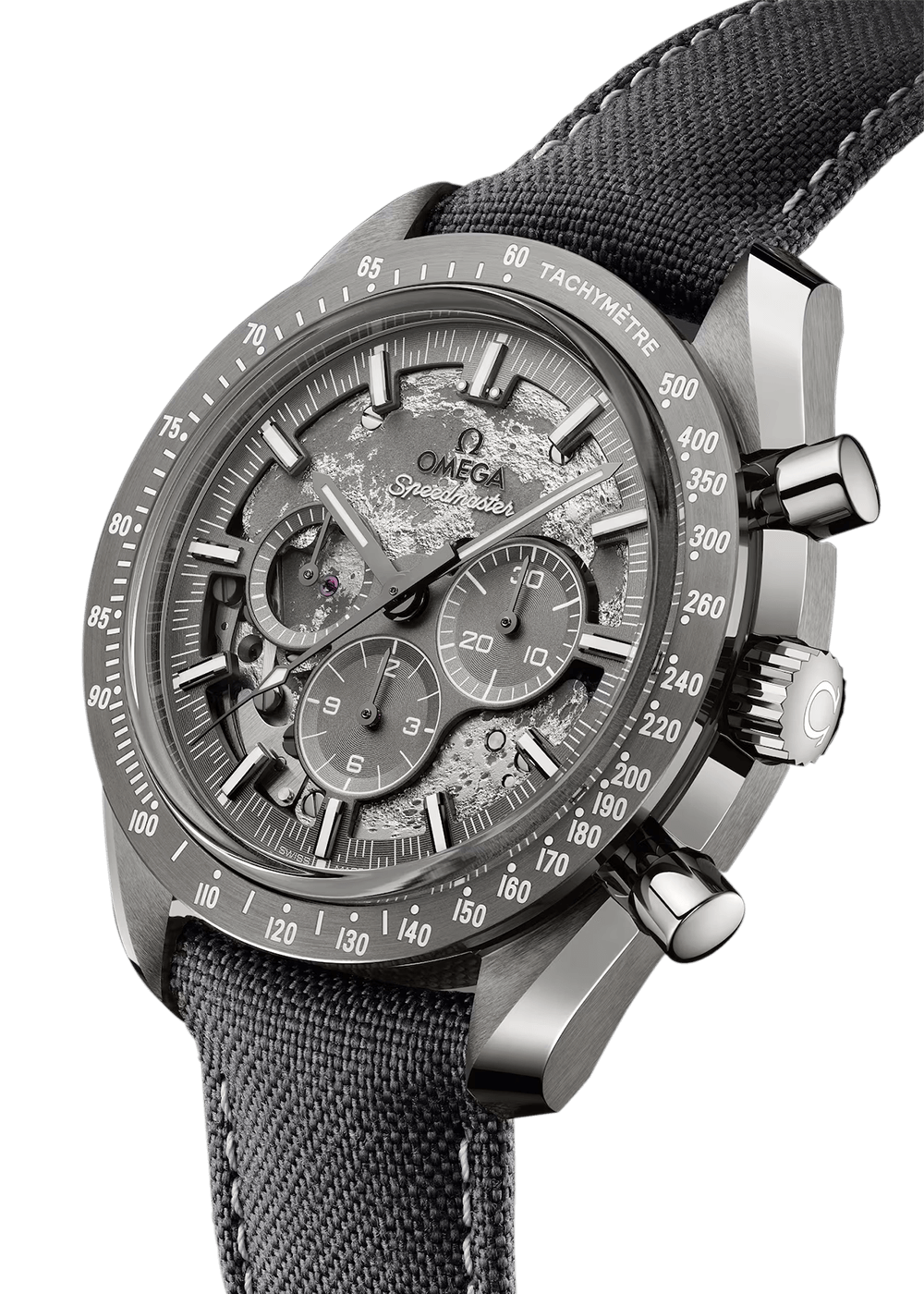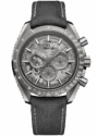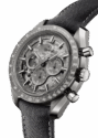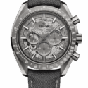 Paying homage to OMEGA’s legacy in space exploration, this Speedmaster Grey Side of the Moon features a 44.25 mm polished grey ceramic case with a plasma coating. The brushed bezel is also made of grey ceramic and features a laser-engraved tachymeter scale filled with white Super-LumiNova.