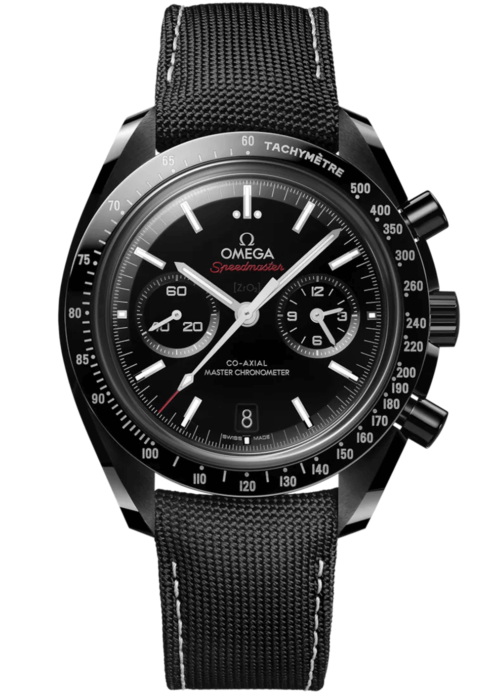 Paying homage to OMEGA’s legacy in space exploration, this Speedmaster Dark Side of the Moon features a 44.25 mm polished black ceramic case. The polished bezel is also made of black ceramic and features a Liquidmetal™ tachymeter scale.