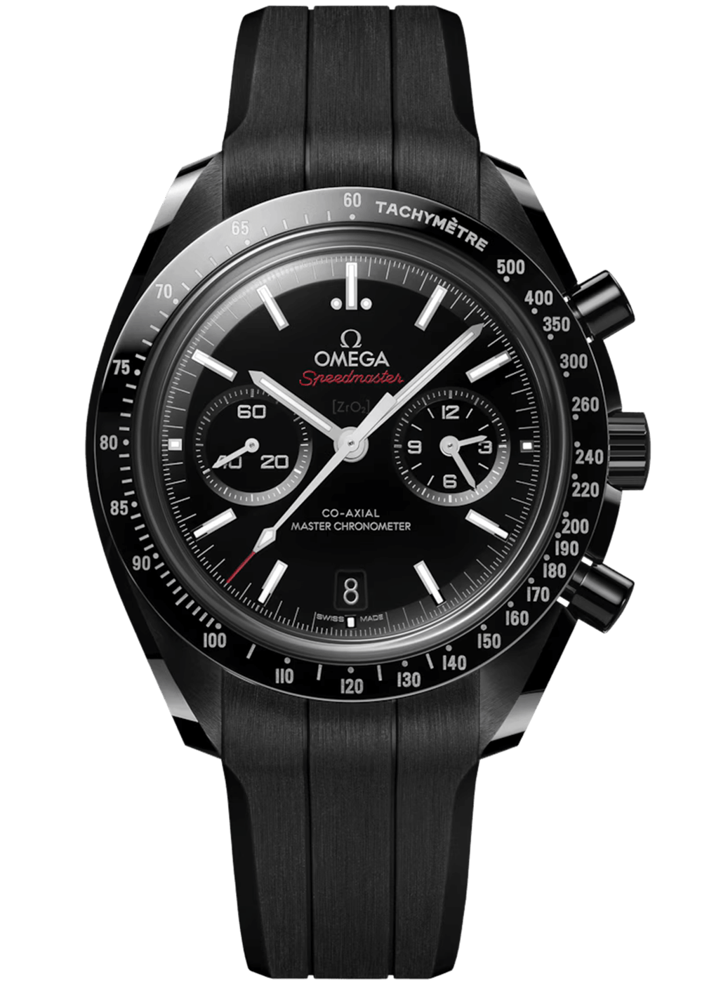 Paying homage to OMEGA’s legacy in space exploration, this Speedmaster Dark Side of the Moon features a 44.25 mm polished black ceramic case. The polished bezel is also made of black ceramic and features a Liquidmetal™ tachymeter scale.