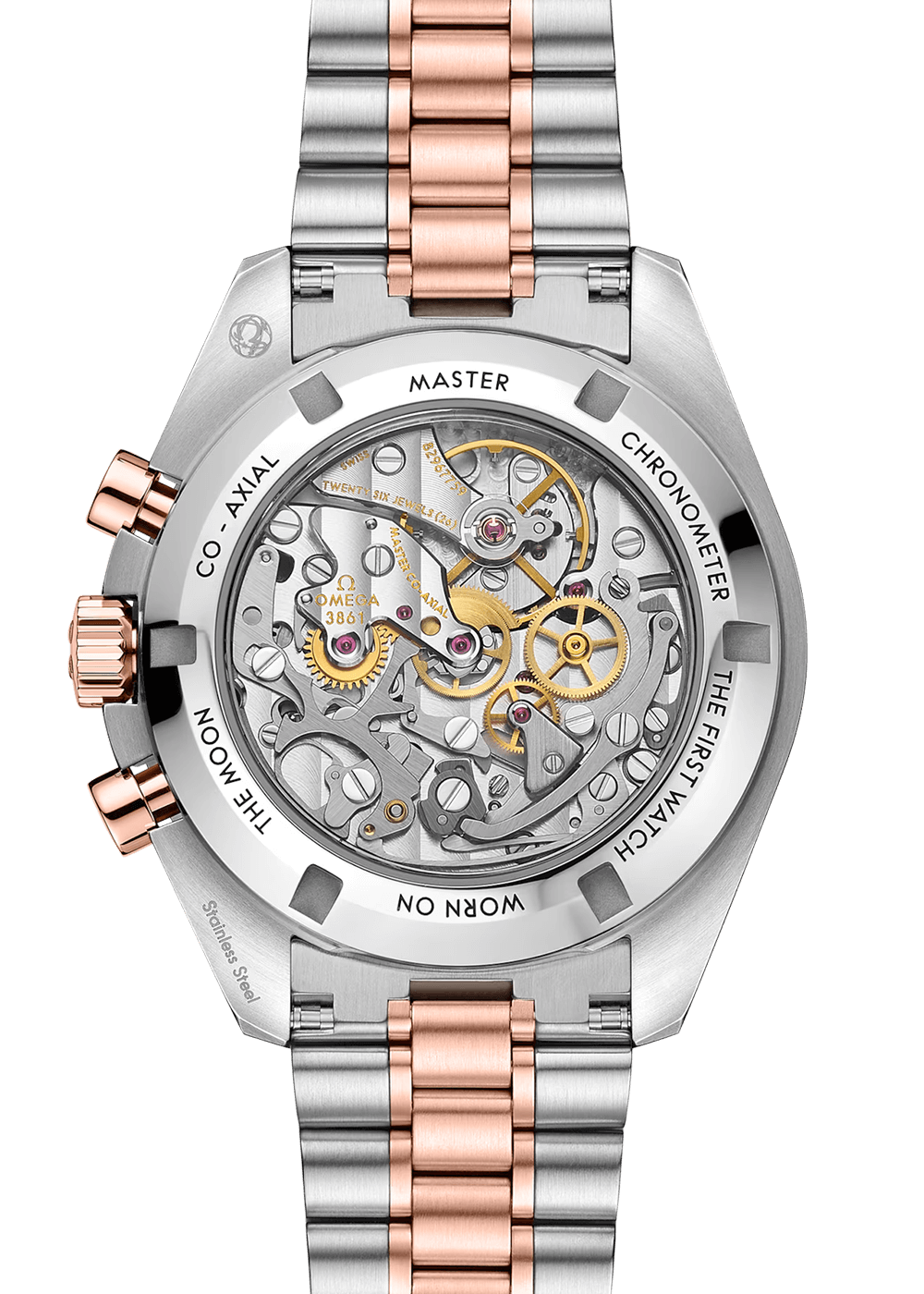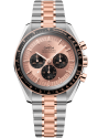 This 42 mm model in stainless steel and 18 K Sedna™ gold is fitted with a sapphire crystal on both the front and back. Drawing inspiration from the fourth generation Speedmaster, it is characterised by an asymmetrical case with a black ceramic bezel ring, an OMEGA Ceragold™ tachymeter scale and the famous ‘dot above 90’.
