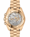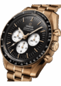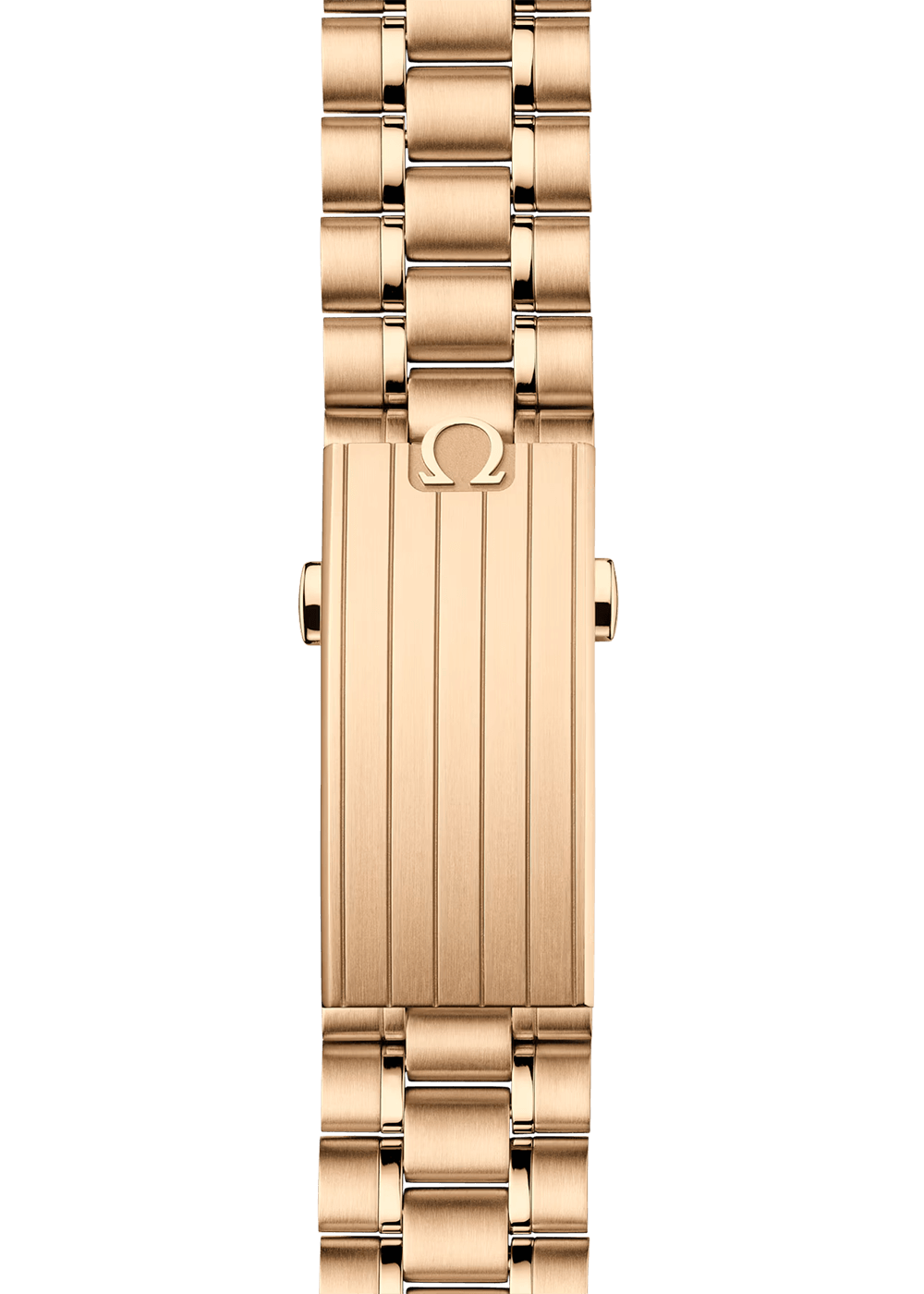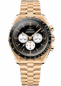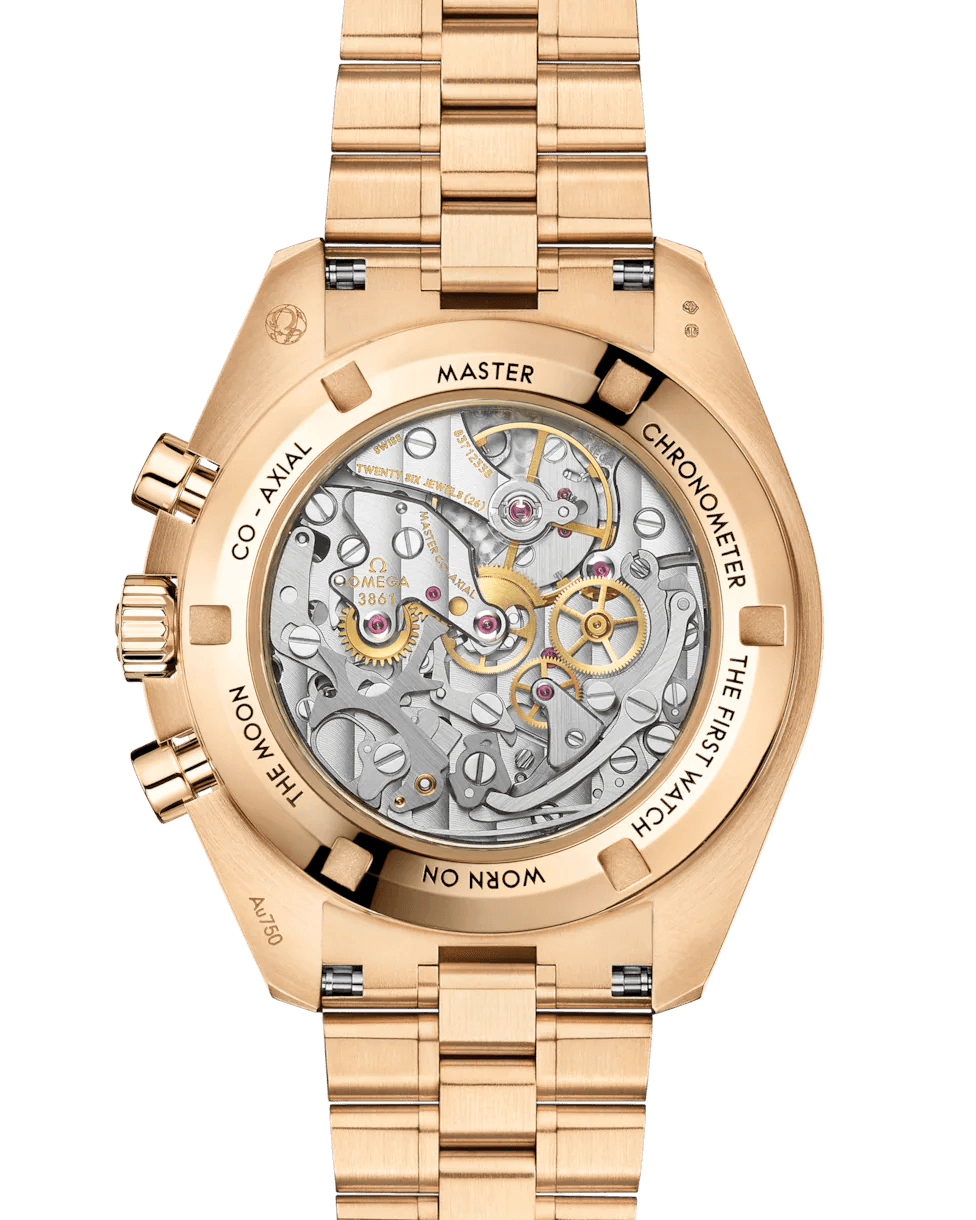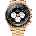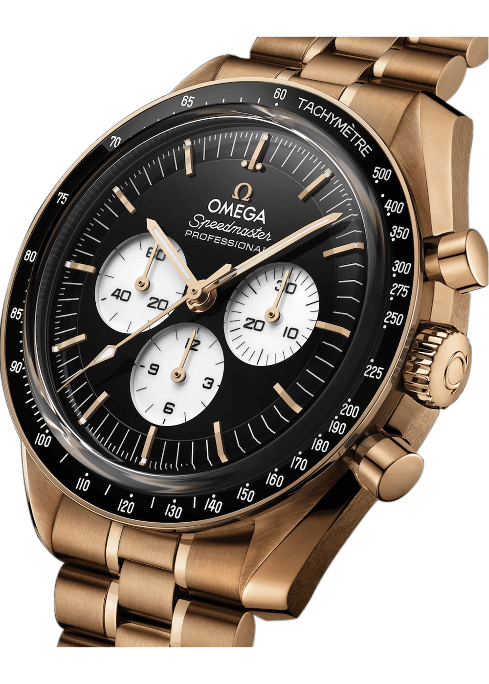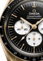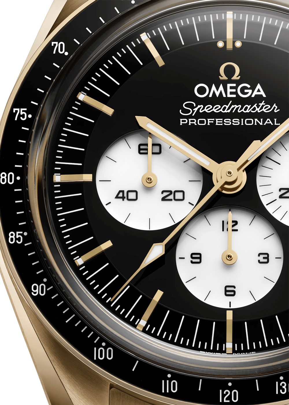 This 42 mm model in 18K Moonshine™ gold features sapphire crystal on the front and back and comes with a polished bracelet in the same precious metal. The design is inspired by the 4th generation Speedmaster worn on the moon. The dial consists of two plates. The upper plate is painted black and refined, while the lower plate with the subdials is painted white and refined.