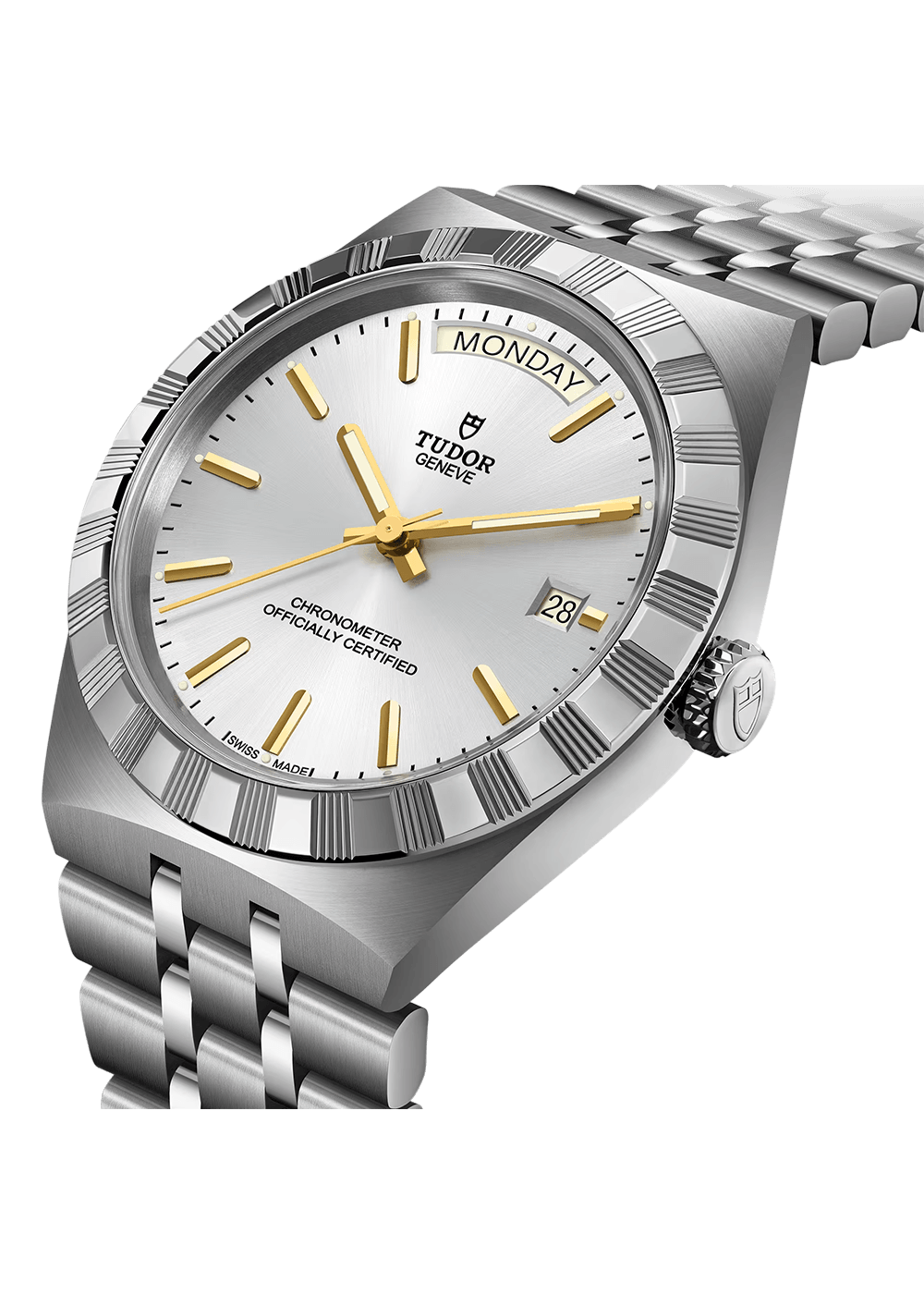 With its integrated metal bracelet, which blends seamlessly into the case, the TUDOR Royal is characterised by a fluid and stylish design. Featuring three wide satin-finished links, flanked by two narrower polished links, and a ‘T-fit’ clasp, the smooth texture of its surfaces highlights the great attention TUDOR pays to wearing comfort. Available in stainless steel or with alternating elements in stainless steel and yellow gold, the models in this line appeal to every taste with their finely finished surfaces.